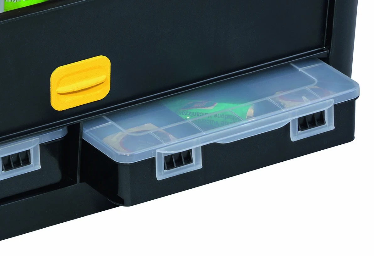 - Beidseitiger Verschlussschieber sichert Sortierkästen auch bei voller Beladung