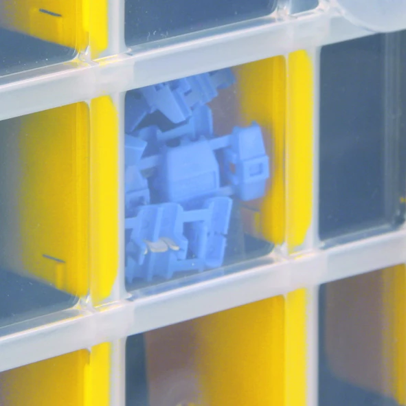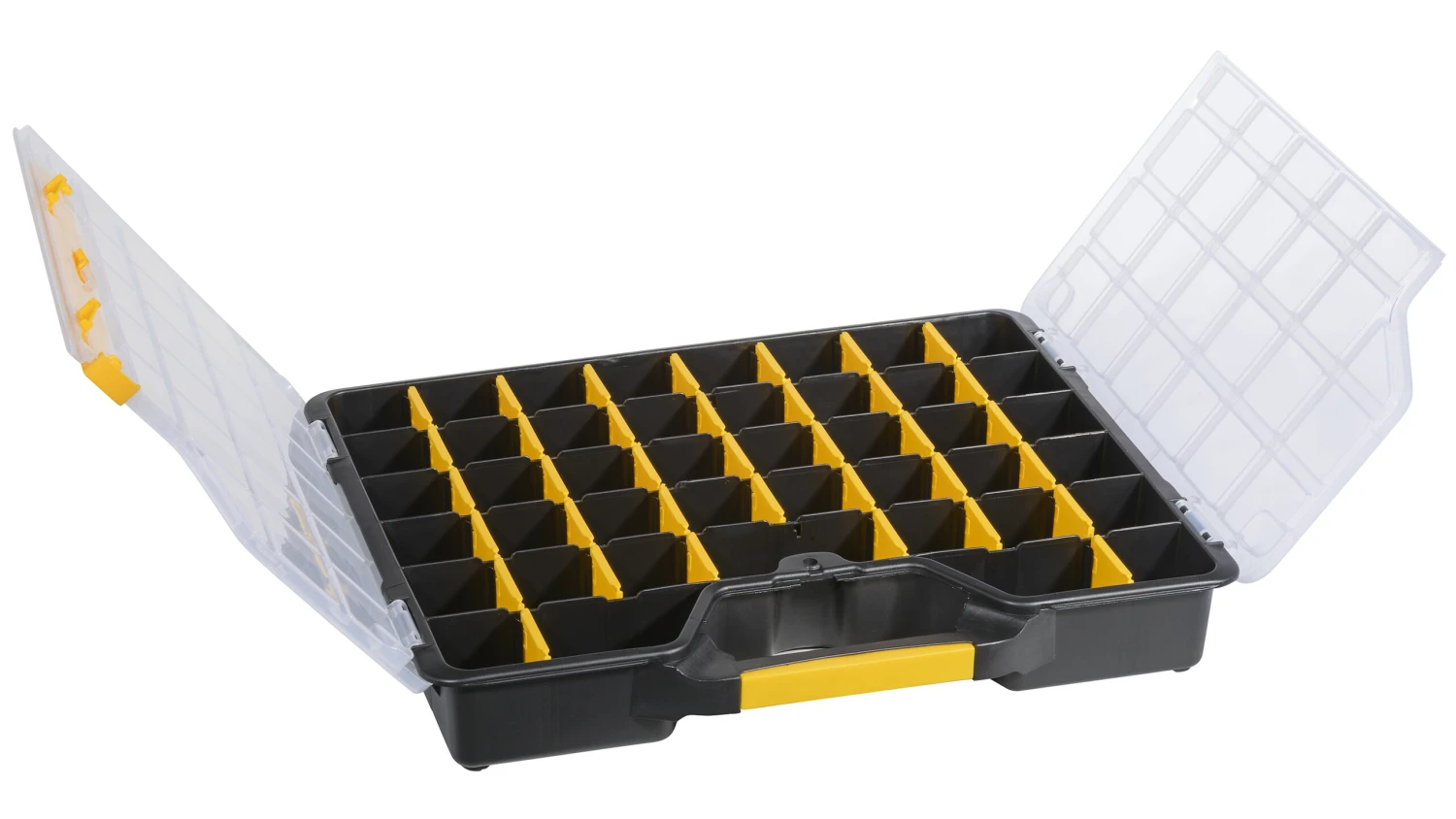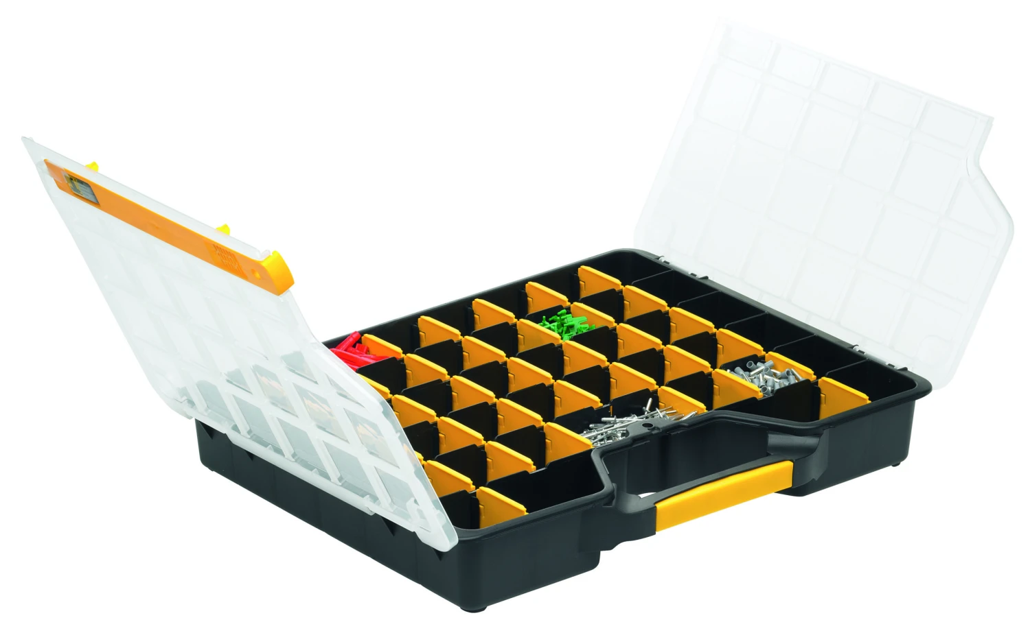 Sichere Sortierung: Fächer schließen fest mit Deckel ab, Einfache Deckelsicherung durch stabilen Verschlussschieber, Individuelle Aufteilung mit 36 flexiblen Trennstegen mit Schwalbenschwanzführung, Ergonomischer Griff, mit handelsüblichen Vorhängeschloss abschließbar.