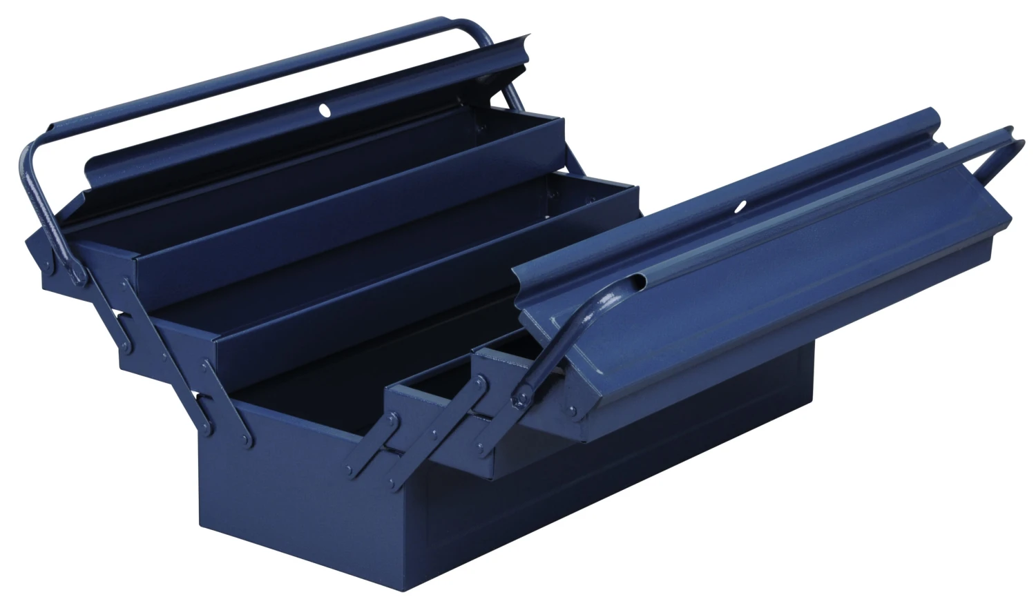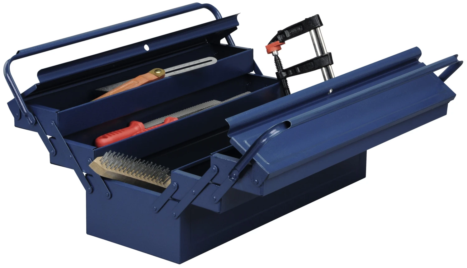 Stabiler Doppelgriff: bequem zu tragen, 4 ausziehbare Fächer, gerundete Kanten, Mit handelsüblichem Vorhängeschloss abschließbar, Pulverbeschichtet mit Hammerschlagoptik.