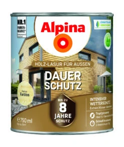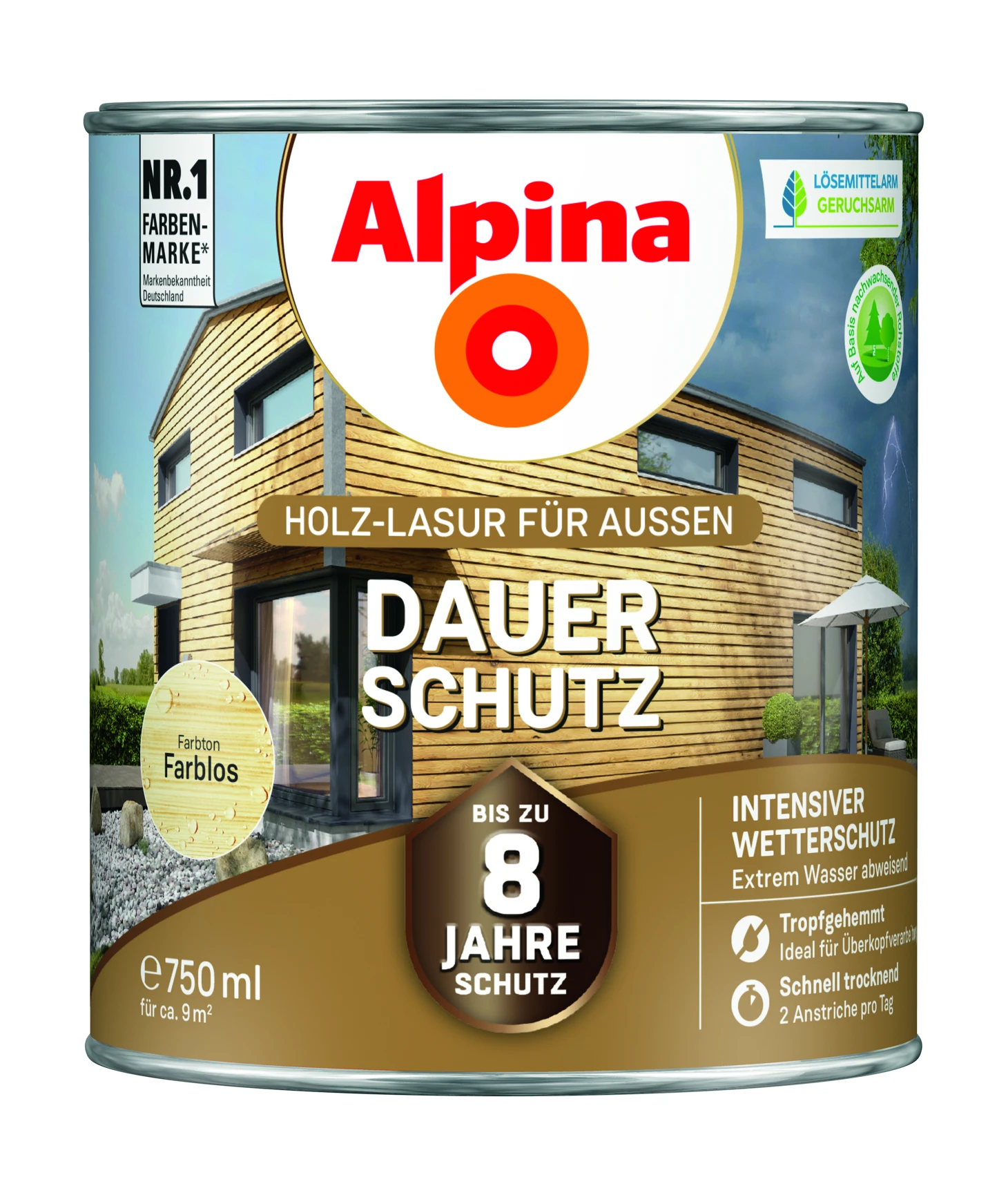 Die Alpina Dauer-Schutz wurde durch das Alpina Entwicklungszentrum in Österreich für raue Witterungsbedingungen wie im Alpenraum formuliert und bietet bis zu 8 Jahre intensiven Langzeit-Wetterschutz.Diese seidenmatte Premium-Mittelschichtlasur schützt mittels UV-reflektierenden Farbpigmenten vor Vergrauen und ist extrem Wasser abweisend. Hochwertige Harze dringen tief in das Holz ein und bilden mithilfeeines widerstandsfähigen Bindemittels einen dauerflexiblen Schutzfilm. Die Lasur ist tropf- und spritzgehemmt, leicht zu verstreichen und ideal für Über-Kopf-Arbeiten.