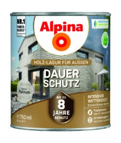 Die Alpina Dauer-Schutz wurde durch das Alpina Entwicklungszentrum in Österreich für raue Witterungsbedingungen wie im Alpenraum formuliert und bietet bis zu 8 Jahre intensiven Langzeit-Wetterschutz.Diese seidenmatte Premium-Mittelschichtlasur schützt mittels UV-reflektierenden Farbpigmenten vor Vergrauen und ist extrem Wasser abweisend. Hochwertige Harze dringen tief in das Holz ein und bilden mithilfeeines widerstandsfähigen Bindemittels einen dauerflexiblen Schutzfilm. Die Lasur ist tropf- und spritzgehemmt, leicht zu verstreichen und ideal für Über-Kopf-Arbeiten.