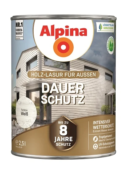 Die Alpina Dauer-Schutz wurde durch das Alpina Entwicklungszentrum in Österreich für raue Witterungsbedingungen wie im Alpenraum formuliert und bietet bis zu 8 Jahre intensiven Langzeit-Wetterschutz.Diese seidenmatte Premium-Mittelschichtlasur schützt mittels UV-reflektierenden Farbpigmenten vor Vergrauen und ist extrem Wasser abweisend. Hochwertige Harze dringen tief in das Holz ein und bilden mithilfeeines widerstandsfähigen Bindemittels einen dauerflexiblen Schutzfilm. Die Lasur ist tropf- und spritzgehemmt, leicht zu verstreichen und ideal für Über-Kopf-Arbeiten.