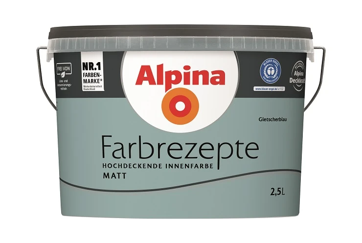 Alpina Farbrezepte Gletscherblau ist ein frisches, nordisch anmutendes Graublau, das seine Wirkung von Ferne und Klarheit allein entfalten kann, aber auch in Kombination mit harmonischen Farbklängen aus der Natur wie Kiesel- und Sandtönen sowie Weiß.