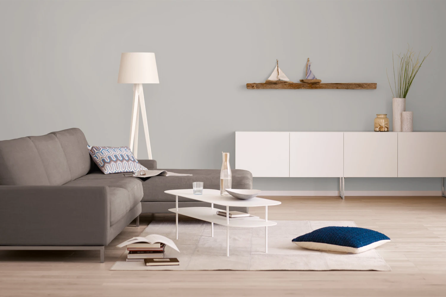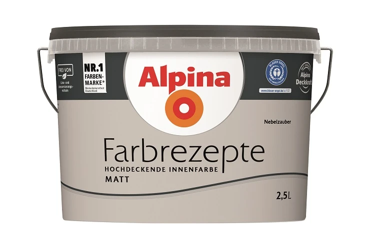 Alpina Farbrezepte Nebelzauber hüllt den Raum mit seiner warmen Leichtigkeit sanft ein. Das helle Grau ist ein bemerkenswerter Soloton, jedoch lässt sich seine Wirkung zusammen mit weiteren Innenfarben noch unterstreichen.
