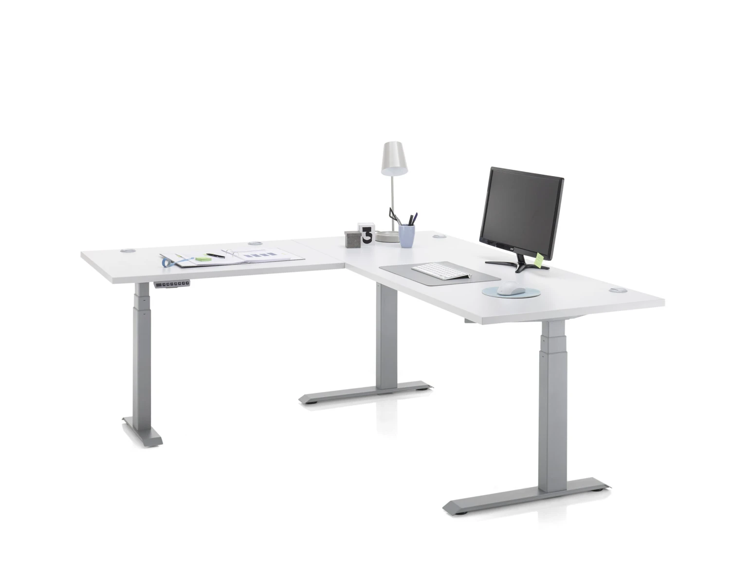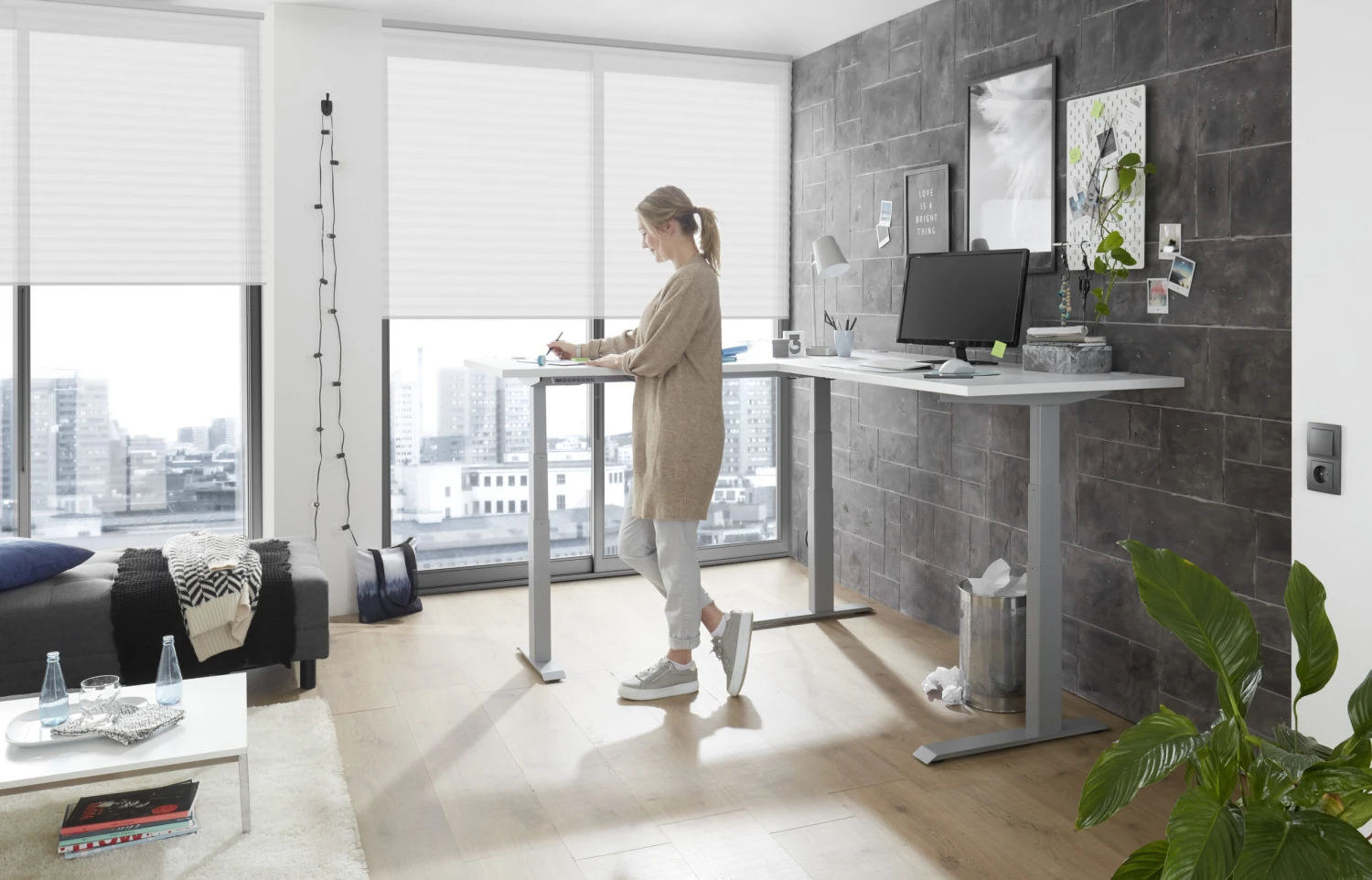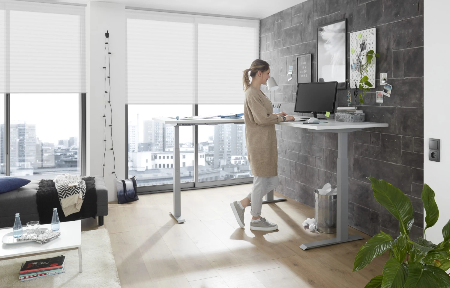 elektrisch höhenverstellbares Schreibtischgestell 4 Memory-Tasten/digitale Höhenanzeige/verstellbar (pulverbeschichtetes Stahlprofil von 64 – 129 cm)Kabeldurchführungen auf der Tischplatte