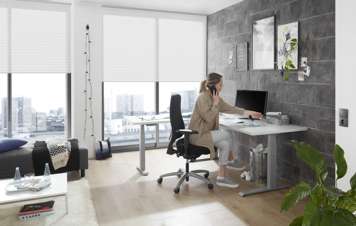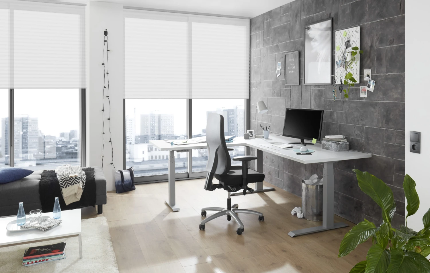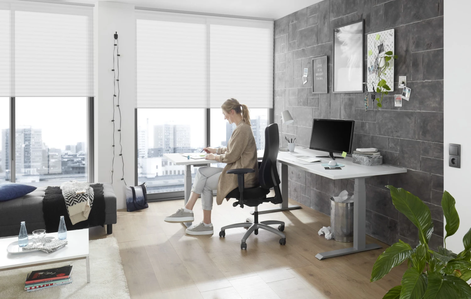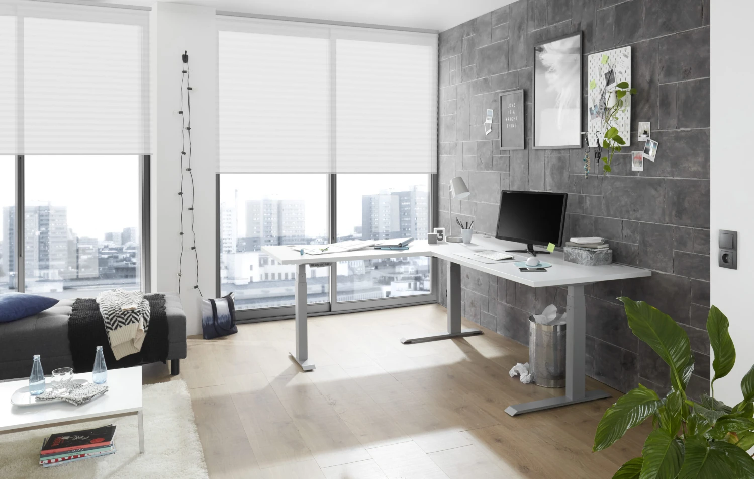 elektrisch höhenverstellbares Schreibtischgestell 4 Memory-Tasten/digitale Höhenanzeige/verstellbar (pulverbeschichtetes Stahlprofil von 64 – 129 cm)Kabeldurchführungen auf der Tischplatte