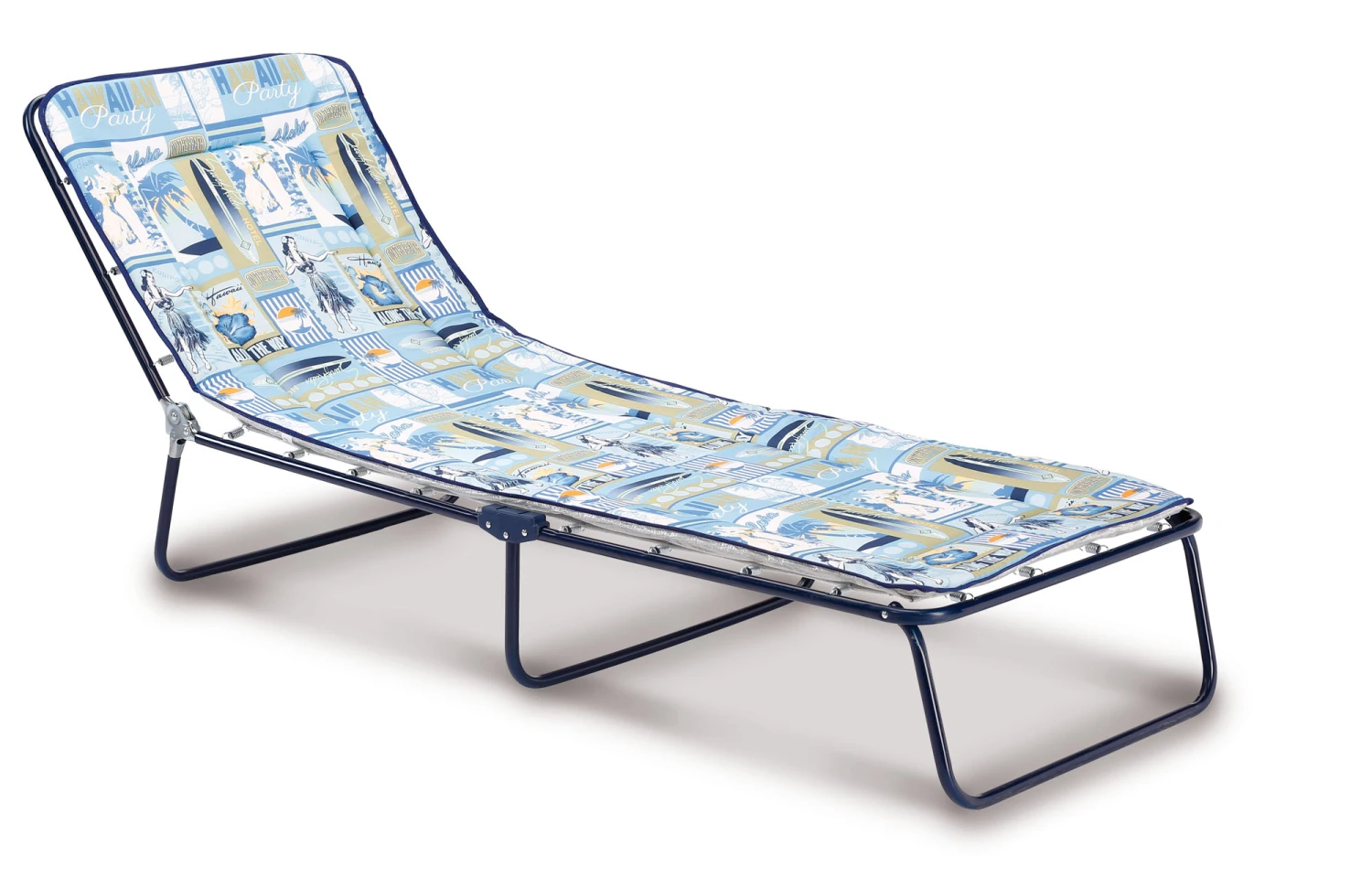 Die 3-Bein-Liege Chiemsee besitzt ein stabiles Stahlrohrgestell mit wetterfester Beschichtung in der Farbe blau. Der unempfindliche und strapazierfähige Bezugsstoff ist 2 cm stark und besteht aus Polycotton. Die Liege ist zusammenklappbar und überall gut zu verstauen. Besonders geeignet für Camping.
