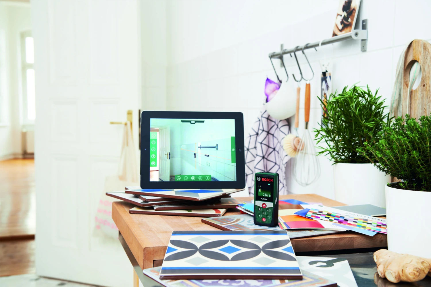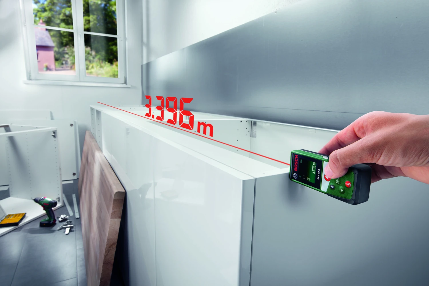 Der PLR 40 C misst Entfernungen bis zu 40 m mit Laserpräzision und erlaubt es, die Größe von Möbeln blitzschnell zu erfassen. Seine integrierten Funktionen ermöglichen Flächen- und Volumenberechnungen, um zu bestimmen, wie viel Bodenbelag, Tapete oder Farbe benötigt wird. Das hochwertige Display sorgt für optimale Lesbarkeit der Messergebnisse. Alle Daten können zur bequemen Dokumentation an die Bosch App gesendet werden.