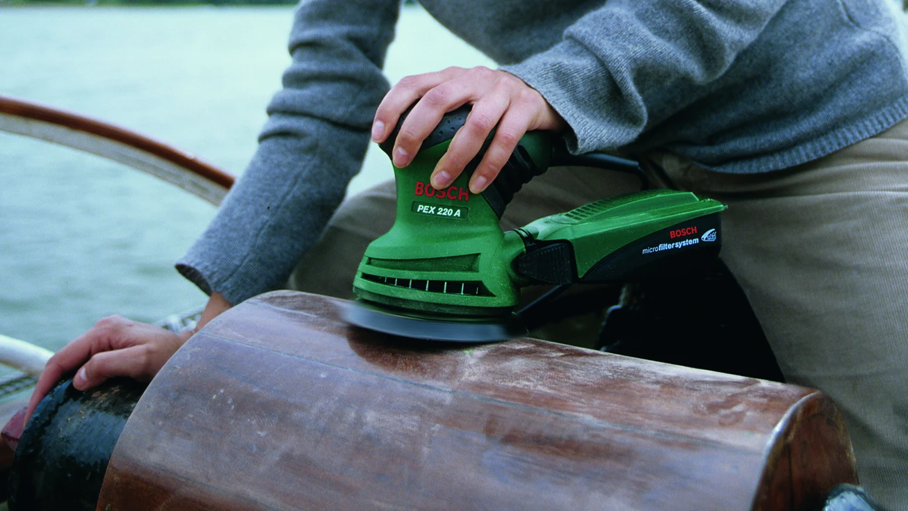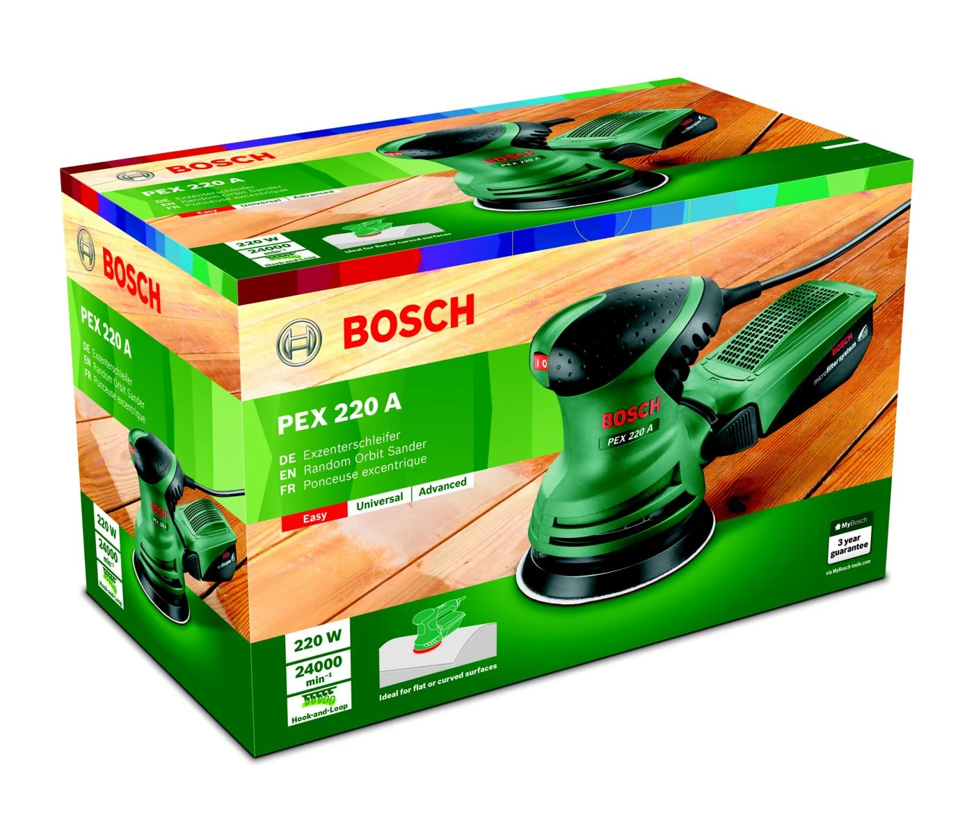 Der Exzenterschleifer Bosch PEX 220 A mit einem kraftvollen 220-Watt-Motor sorgt für feinsten Schliff bei hoher Schleifleistung und für beste Ergebnisse, auch beim Polieren. Mit Maßen von 347 x 70 x 220 Millimetern (Länge x Breite x Höhe) und einem Gewicht von 1,4 Kilogramm ist das Schleifsystem kompakt ausgefallen und lässt sich daher leicht bedienen. Das eingebaute Staub-Saugelement nimmt den Staub direkt am Werkstück auf und leitet ihn in die mitgelieferte Micro-Filterbox weiter. Technische Daten: 1) Nennaufnahme: 220 W 2) Schleifteller-Ø: 125 mm 3) Schwingzahl: 24.000 min-1 4) Schwingkreisdurchmesser: 5 mm 5) Schwingungsemissionswert ah: 3,5 m/s² 6) Ausstattung: Bosch Microfilter, Gummischleifteller, 1 Schleifblatt (Red Wood)