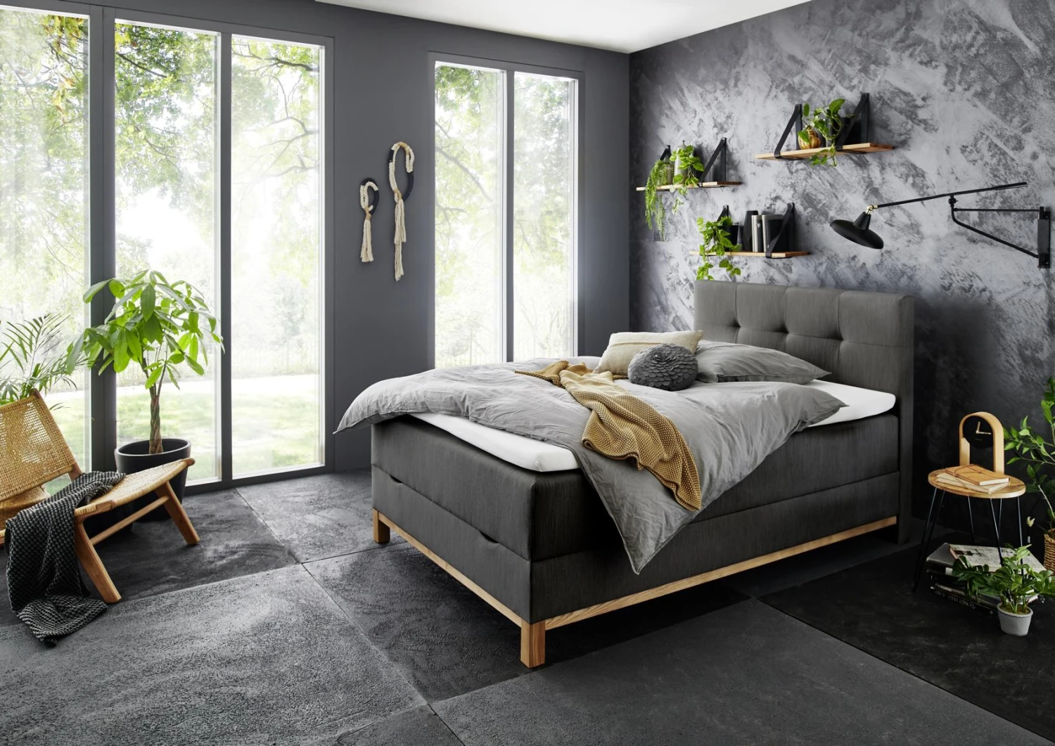 - Gestell und Füße aus massiver Esche in eichefarbig, Bezug aus Stoff in Anthrazit