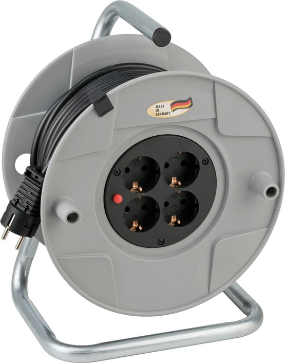 Kabeltrommel AK 260 50 m H05VV-F 3G1,5 27 * Trommelkörper aus bruchfestem Kunststoff. * 4 Steckdosen mit Überhitzungsschutz. * Feststell- und Abrollbremse, TÜV/GS.