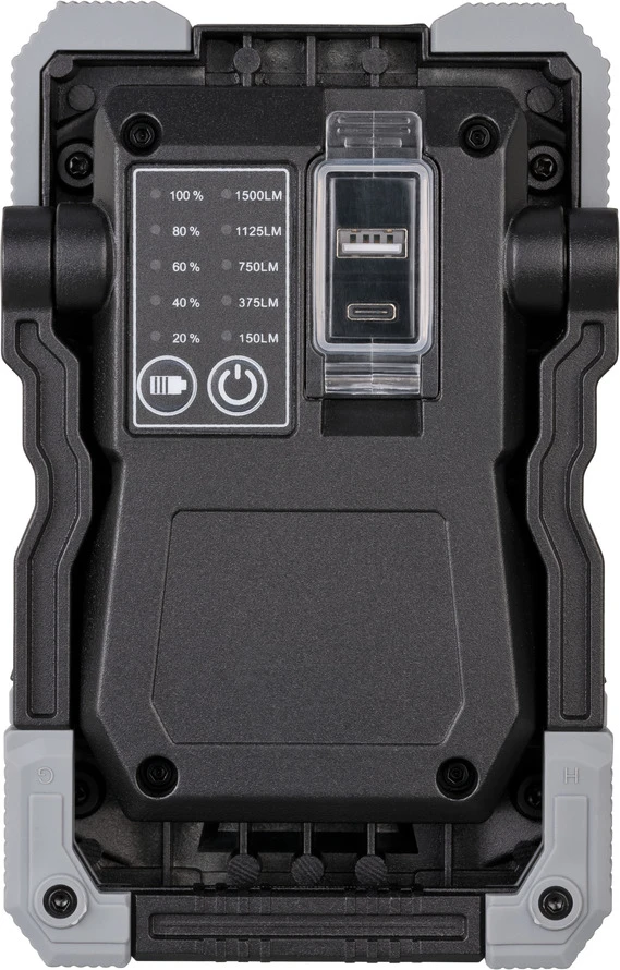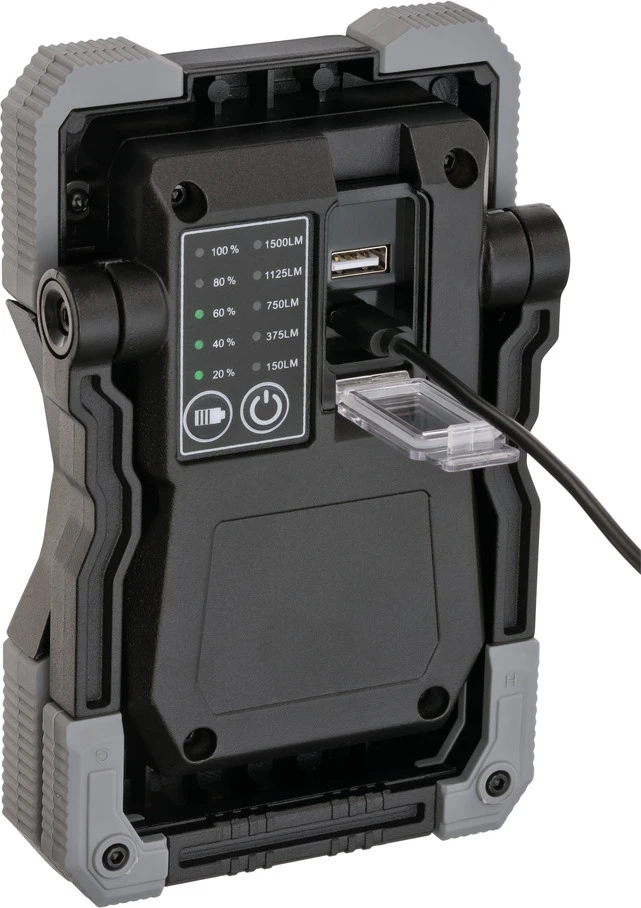 Mobiler LED Akku Strahler RUFUSÂ 1500 MA, 1500lm, IP65 Lichtstark, vielseitig und unverwüstlich. * Immer helles Arbeitslicht auch an Orten ohne Stromanschluss. * Schalter mit Funktionen Licht: 100 % – 75 % – 50 % – 25 % – 10 %. * USB-Ladekabel Typ A / C. * Li-lon Akku 3,7 V/5 Ah mit Powerbank Funktion und Ladeanzeige. * Powerbank-Funktion: USB-Ladeanschluss 1 A für Geräte mit USB Ladekabel wie Smartphones, Tablets, etc. * Gehäuse aus Aludruckguß, Kantenschutz aus hochwertigem Kunststoff. * Stoßfest und sturzsicher aus bis zu 3 m Höhe, IK08. * Stabiles, mehrstufig ausklappbares Gestell. * Mit passender robuster Tasche für den sicheren Transport. * Im farbigen Verkaufs-Karton.