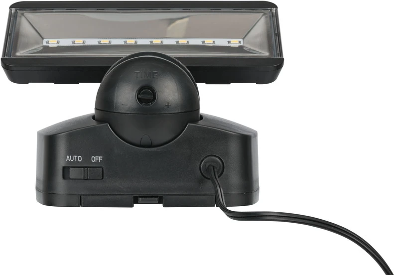Solar LED-Strahler SOL 800 IP44 mit Infrarot-Bewegungsmelder anthrazit Für den Einsatz im Freien, IP 44. * Unabhängig vom Stromnetz zu betreiben – ideal für Carports, Vordächer, Gärten. * 8 superhelle hochwertige Marken LEDs für gute, großflächige Ausleuchtung. * Solarmodul unabhängig von dem Strahler auf der Sonnenseite montierbar (inkl. 4,75 m Verbindungskabel). * Bedienerfreundliche Montage. Leuchte- bzw. Strahlerkopf wird nach der Montage einfach auf die Halterung gesteckt. * Strahler horizontal und vertikal schwenkbar. * Schwenkbarer Infrarot-Bewegungsmelder mit max. 180° Erfassungswinkel und max. 12 m Reichweite. * Einschaltdauer regelbar bis max. ca. 1 Minute. * Inklusive Li-Ion Akku 3,7 V/3,6 Ah mit eingebautem Überladungs- und Tiefentladungsschutz. * Leuchtdauer bei voll geladenem Akku ca. 3 Stunden. * Lademöglichkeit für Schnellladung über Netzteil (nicht enthalten). * Solarmodul: 200 x 160 mm – Solarleistung 2 Wp. * Im farbigen Verkaufs-Karton.