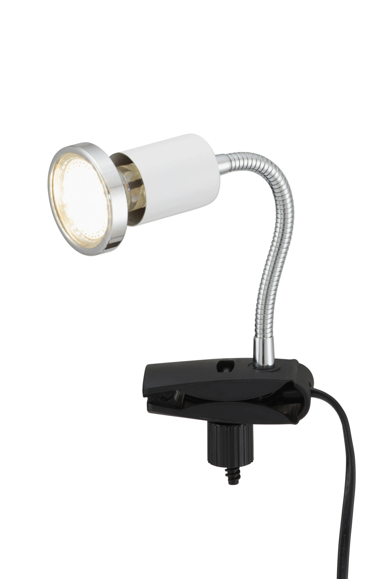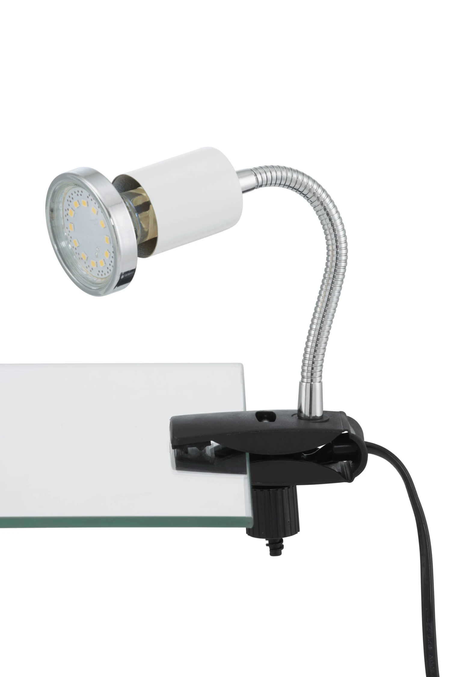 LED Klemmleuchte, 1-flammig „SIMPLE“ Metall-Kunststoff / weiß, inkl. 1 x LED/GU10 3W, 250lm, 3.000K, Lebensdauer 25.000 h, Ra>=80, nicht dimmbar, inkl. Schnurschalter, inkl. Flexarm, inkl. Chromring, inkl. Schraubklemme, IP20, 140x35x140mm (HxBxA)