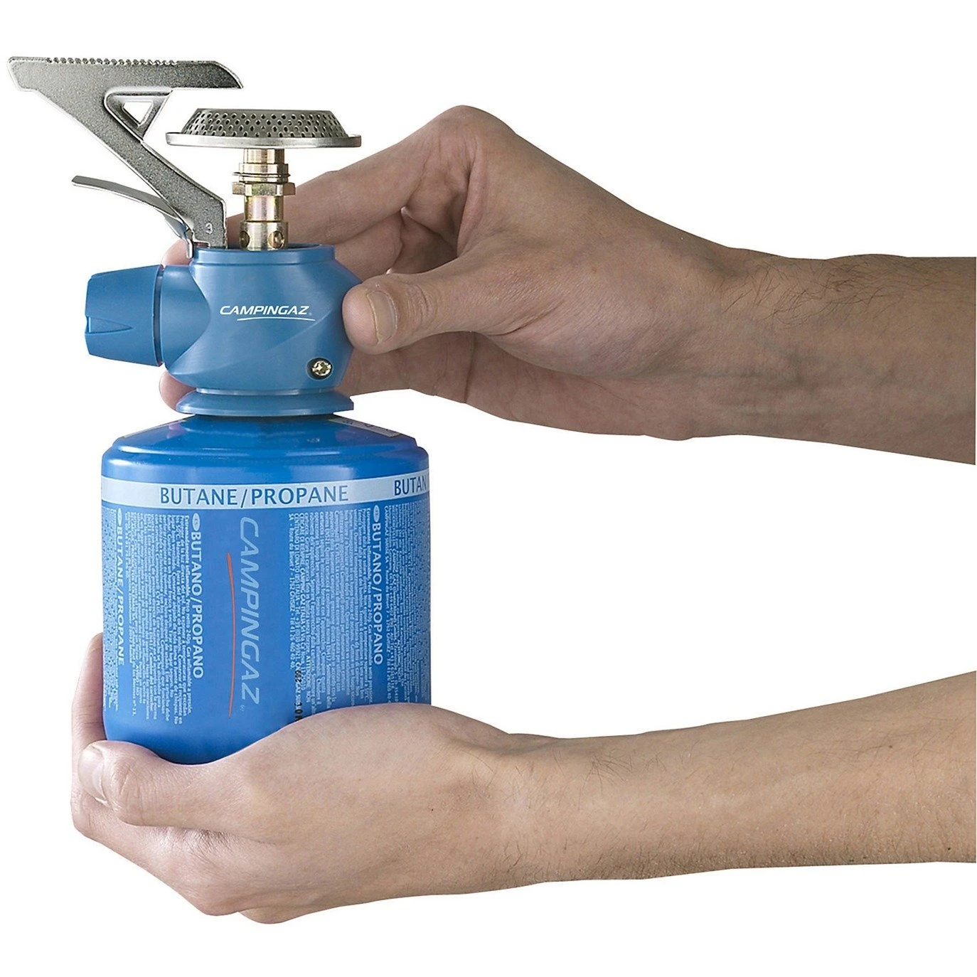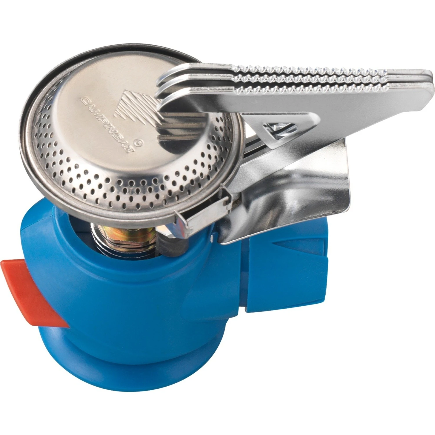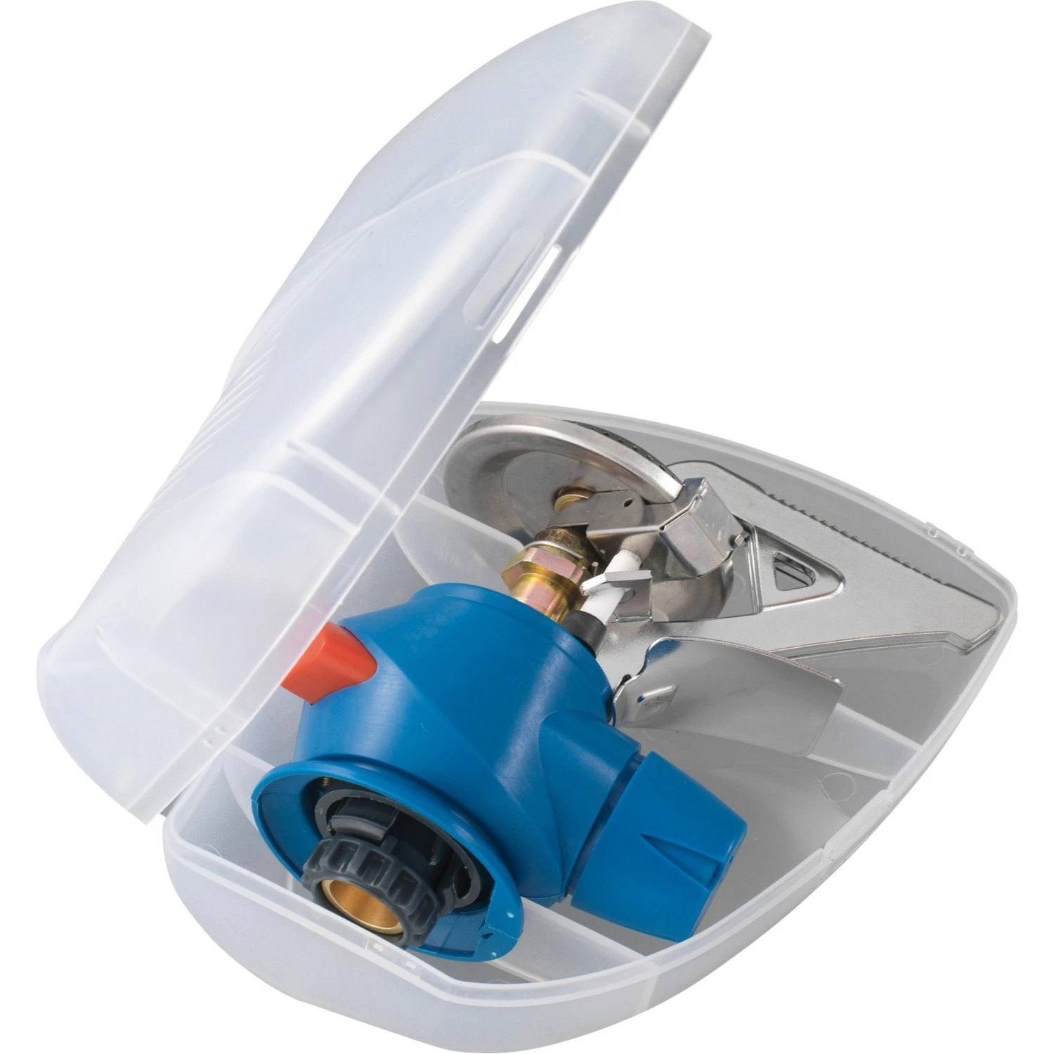 Kompakter Trekkingkocher mit Easy Clic Plus-Anschluss für Ventilkartuschen der Linie CV Plus. 3 Topfträger mit Windschutz, kompakt zusammenlegbar. Stufenlose Flammenregulierung, Piezozündung, Leistung 2.900 Watt.