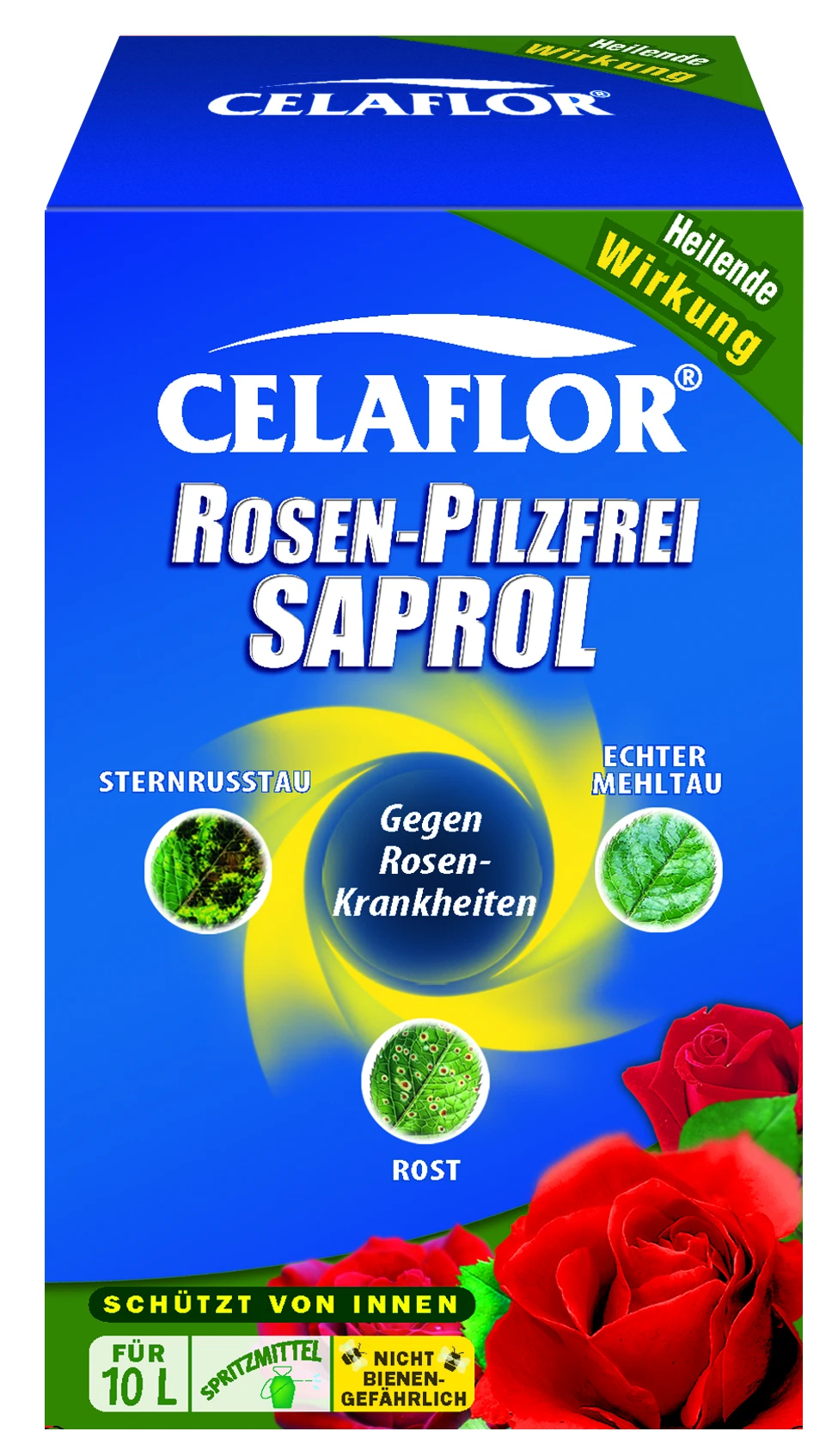 Celaflor Rosen-Pilzfrei Saprol ist ein systemisches Fungizid mit vorbeugenden und im Frühstadium heilenden Eigenschaften zur Bekämpfung von Pilzkrankheiten (Echten Mehltau, Sternrußtau und Rost) an Rosen. Der Wirkstoff dringt in das Blattgewebe ein, bekämpft dort vorhandenen Befall und schützt vor Neubefall.