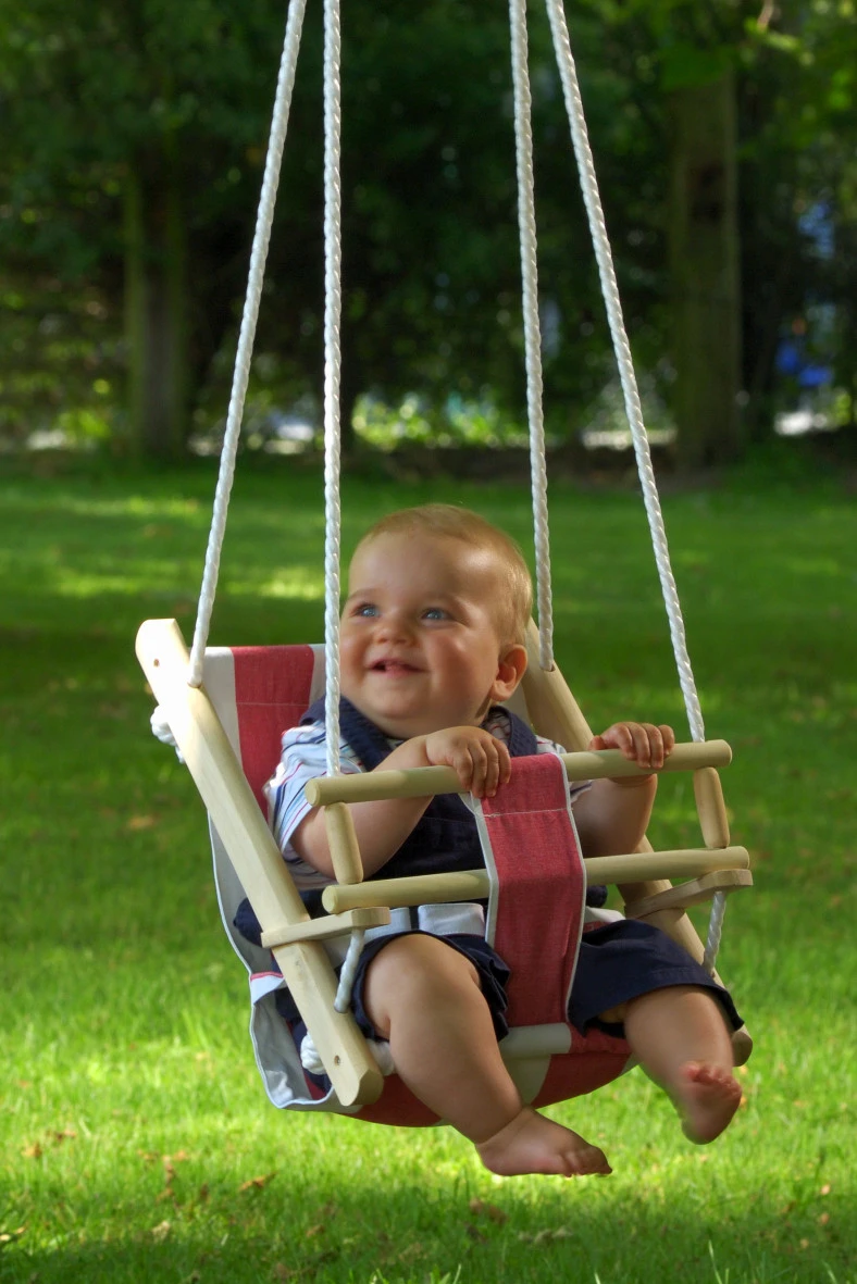 Für Kinder von 9 – 24 Monaten. Aus unbehandeltem Hartholz in festem Baumwollstoff als Sitzfläche eingearbeitet, 29 cm Sitzbreite. PP-Seil mit geschweißter, verzinkter Aufhängung. Längenverstellbar bis 200 cm, Sicherheitsgurt mit Klemmesch.