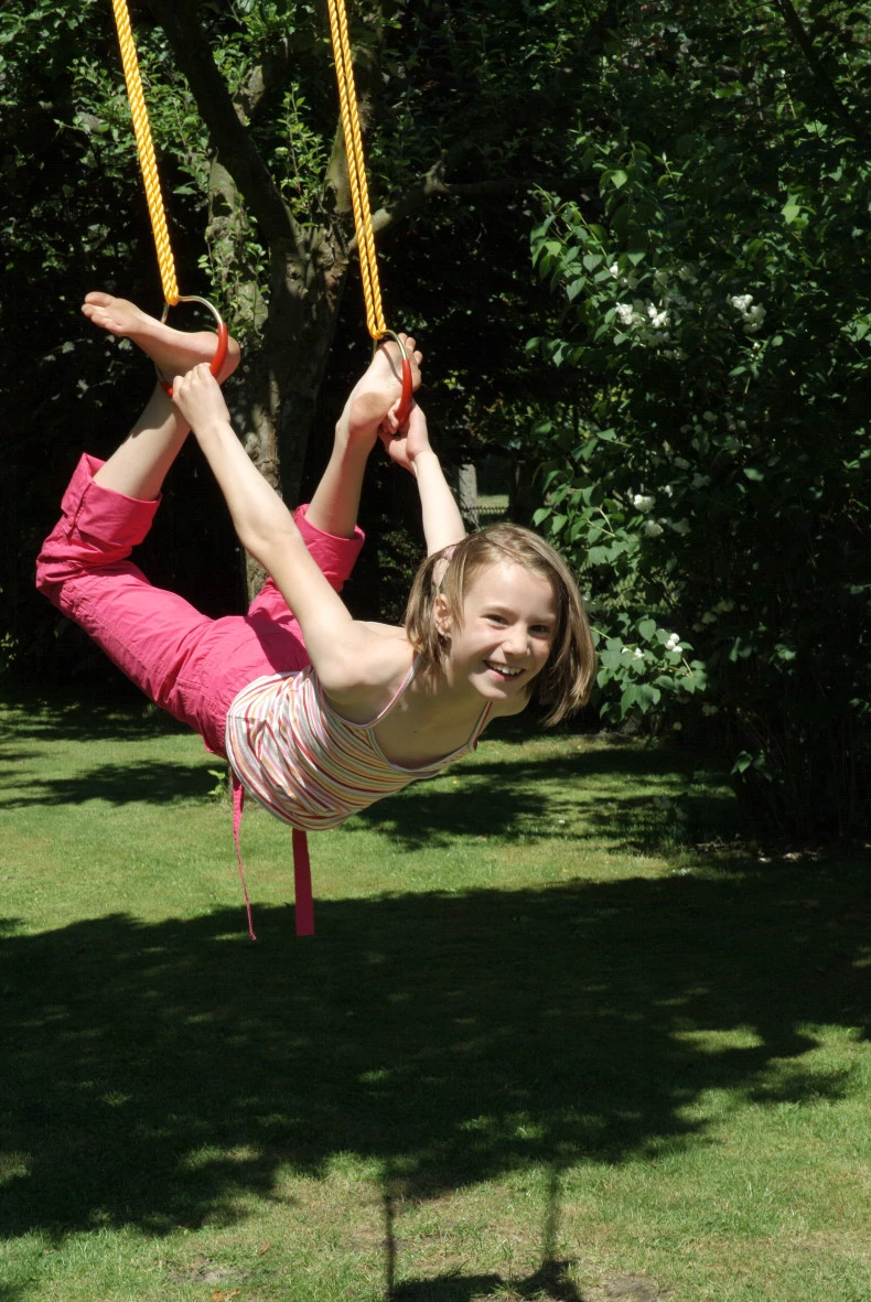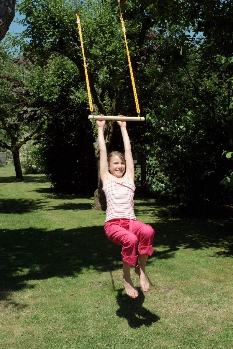 Inhalt: 1 Brettschaukel, 1 Trapez, 2 Turnringe, 2 Seile 10 mm ø mit Aufhänge-Ringen. TÜV-GS-geprüft.