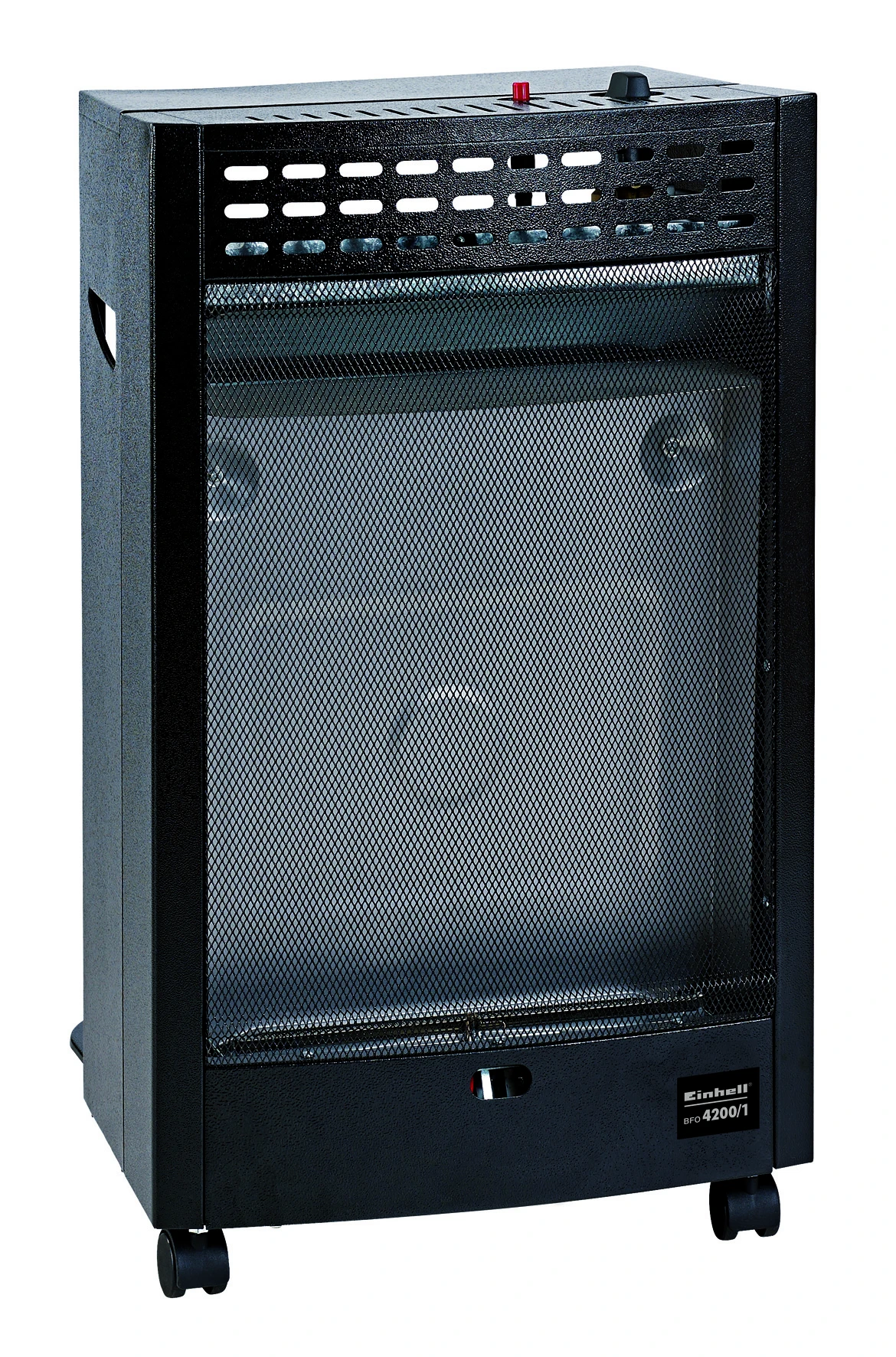 Der BFO 4200/1 ist mit 4 praktischen Lenkrollen ausgestattet, die höchste Mobilität gewährleisten. Der integrierte Gasflaschenaufstellraum sorgt für die sichere und platzsparende Verstauung der angeschlossenen Gasflasche. Der Blue Flame-Brenner erzeugt eine angenehme Konvektionswärme, während Sauerstoffmangelsicherung, Gasdruckregler sowie thermoelektrische Zündsicherung den sicheren Betrieb des Heizgerätes gewährleisten. Dank Piezozünder ganz einfach in Betrieb genommen, kann die Heizflamme entsprechend der gewünschten Raumtemperatur eingestellt werden. Ein Gasschlauch ist bereits im Lieferumfang enthalten. In Deutschland darf das Gerät in gut belüfteten Räumen nur mit einem 50 mbar Innenraum-Gasdruckregler (2 Druckstufen, Druckmanometer und thermischer Sicherung) verwendet werden. Der Artikel ist für den Gebrauch in DE + AT konzipiert (50 mbar).