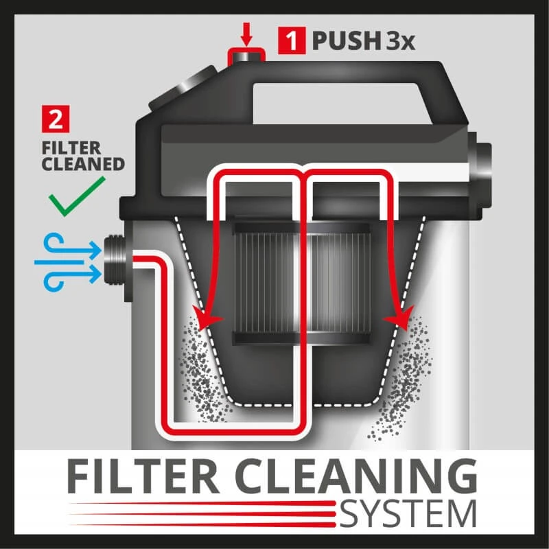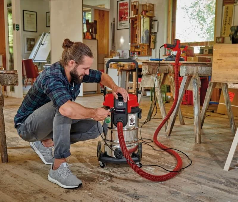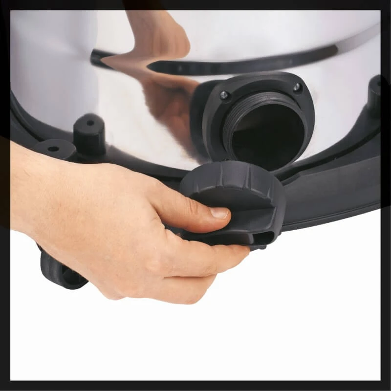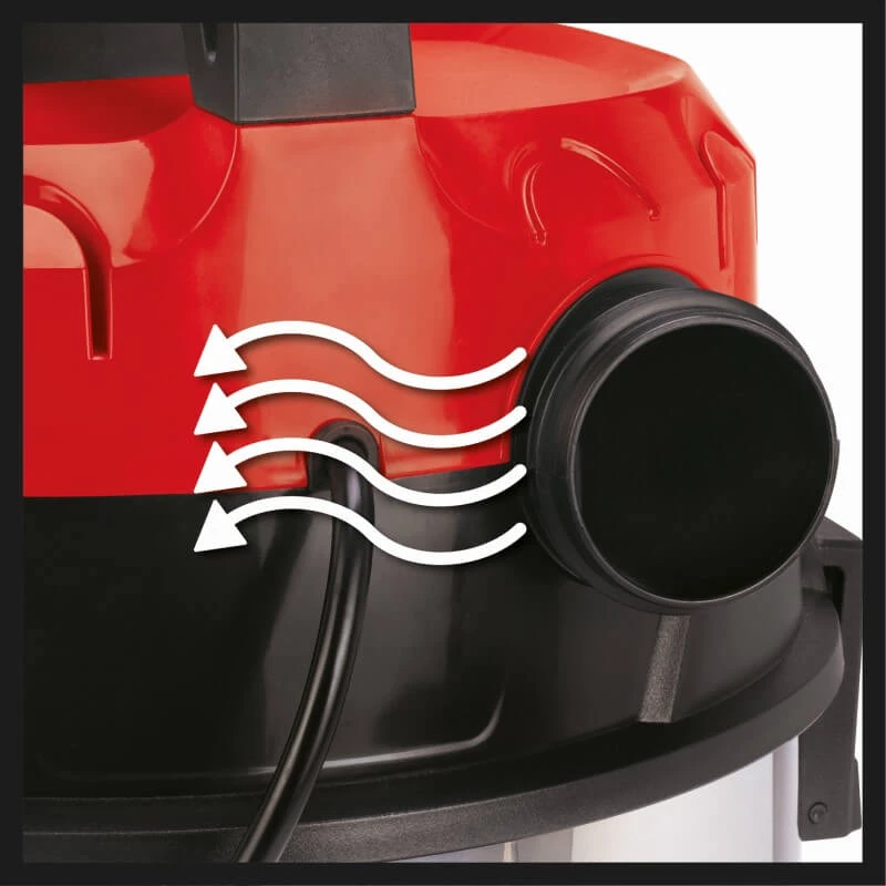 Der Einhell Nass-Trockensauger ist als ECO Staubsauger für hohe Saugleistung bei geringem Stromverbrauch konzipiert. Der rostfreie Edelstahlbehälter fasst 30 l. Der Sauger verfügt über einen Fehlluftregler am Handgriff und einen Blasanschluss. Große Räder und Rollen gewähren einen einfachen Transport. Am Gehäuse integriert ist eine automatische Gerätesteckdose zum Betrieb von Elektrowerkzeugen und eine praktische Zubehörhalterung. Kabelaufwicklung sowie Wasserablassschraube sind vorhanden. Im Lieferumfang enthalten sind ein Teleskoprohr aus Edelstahl (Ø 36 mm), ein 3 Meter Plastiksaugschlauch, eine große Kombi-, Fugen und Polsterdüse sowie Schaumstofffilter, Faltenfilter und Papierschmutzfangsack.