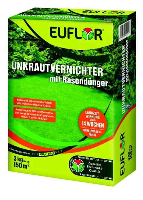 Unkrautvernichter mit Rasendünger granuliert 20+5+8, 7,2 g/kg 2,4-D und 1 g/kg Dicamba Spezial-Rasendünger mit wirkungsvollem Unkrautvernichter. mit einer Langzeitwirkung von bis zu 14 Wochen. Bekämpft schnell und effizient alle typischen Rasenunkräuter. Ausgewogene Nährstoffkombination sorgt für einen kräftig grünen Rasen frei von Unkraut. Streuwagenfähig.