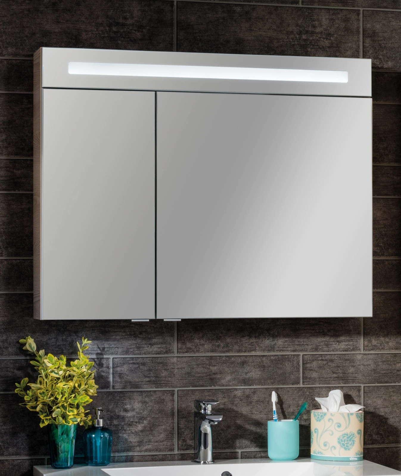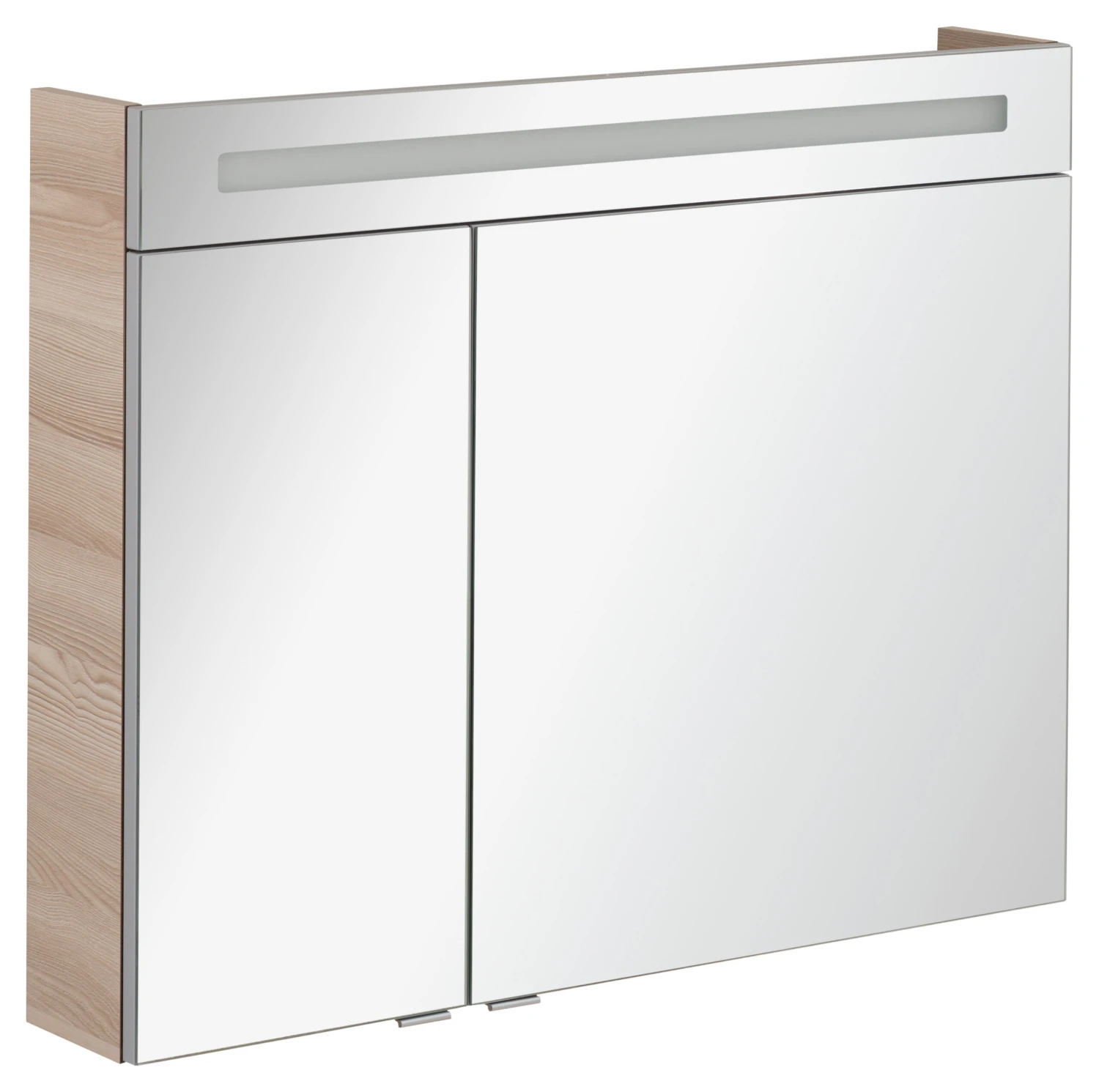 FACKELMANN 82976 B.clever Spiegelschrank, B 90 x H 70,6 x T 15,8 cm, Korpus Alaska-Esche-Optik, Querteile, Rückwand und Türen grau, 3D-Effekt für Rundum-Styling durch 2 innenverspiegelte Türen, Türanschlag wählbar, gedämpfte Scharniere, 2 Glaseinlegeböden, LED-Spiegelblende 7,7W, Elektrobox mit Schalter+Steckdoese, zerlegt zur Selbstmontage, wasserfeste quellsichere Verleimung. Für zusätzliches Licht von oben kann eine passende LED-Leuchte aufgesetzt werden. Variable Vielfalt im Bad – FACKELMANN B.clever! Das Badmöbel-Programm B.clever von FACKELMANN hält was sein Name verspricht. Clevere Lösungen für das kleine und große Bad, in perfekter Harmonie mit modernem Design, attraktiven Dekoren und erstklassiger Qualität. Be clever: Sei schlau ! … und Dein Lieblingsbad gehört Dir !