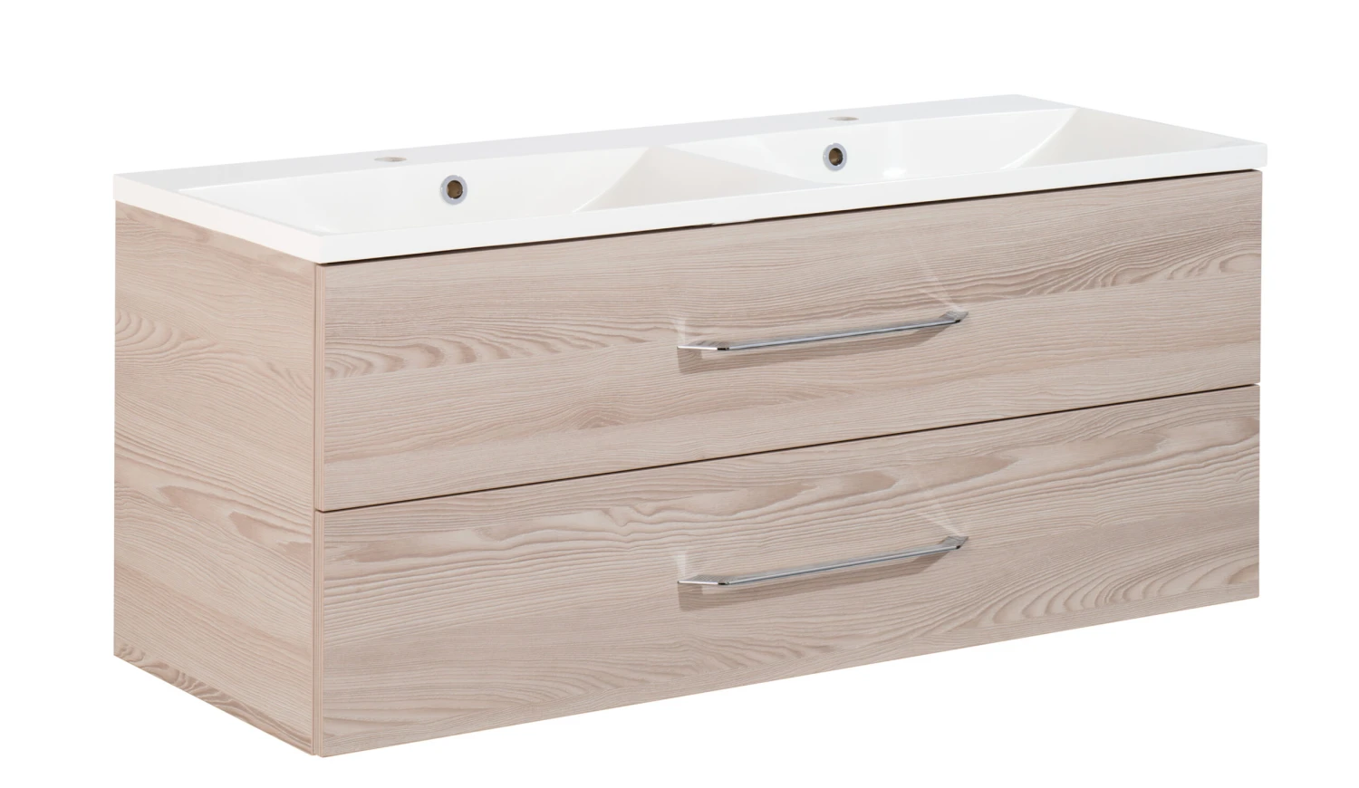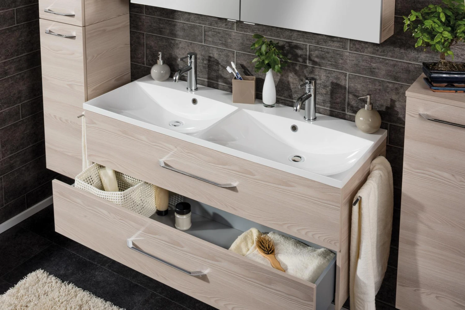 FACKELMANN 82926 B.clever Set DSBecken+Waschtischunterbau 120x51x46 EsAl. Variable Vielfalt im Bad – FACKELMANN B.clever! Das neue Badmöbel-Programm B.clever von FACKELMANN hält was sein Name verspricht. Clevere Lösungen für das kleine und große Bad, in perfekter Harmonie mit modernem Design, attraktiven Dekoren und erstklassiger Qualität. Vier Waschtisch-Varianten in weißem Gussmarmor erlauben die individuelle Gestaltung des Bades und die Anpassung an die vorhandene Raumgröße. Ein Spiegel oder Spiegelschrank mit moderner, energiesparender LED-Technik kann jeweils in passender Breite (60 cm, 90 cm, 120 cm) über dem Waschtisch platziert werden, so dass von der Gäste-Bad-Variante bis hin zum Familien-DoppelBecken viele Varianten planbar sind. Eine energiesparende LED-Blende sorgt für die richtige Beleuchtung. Für zusätzliches Licht von oben kann eine passende LED-Leuchte aufgesetzt werden. Das neue FACKELMANN Programm setzt für Korpus und Front das dunkle, edle Dekor Ulme Madera sowie die helle Alaska-Esche ein. Diese natürlichen Holznachbildungen bringen wohnliche Atmosphäre ins Bad und harmonieren perfekt zu hellen oder dunklen Fliesen und Accessoires. Ebenso erhältlich: das klassische Weiß in matt (Korpus) und Hochglanz-Ausführung (Front). Als Griff (im Lieferumfang enthalten) kommt bei B.clever eine besonders designte Metallreling in chromglänzender Optik zum Einsatz. Im gleichen Design ist ein eleganter Handtuchhalter erhältlich.Für enormen Stauraum sorgen im Sortiment Midi- und Hochschränke in den drei Korpus- und Frontvarianten. Be clever: Sei schlau ! … und Dein Lieblingsbad gehört Dir !