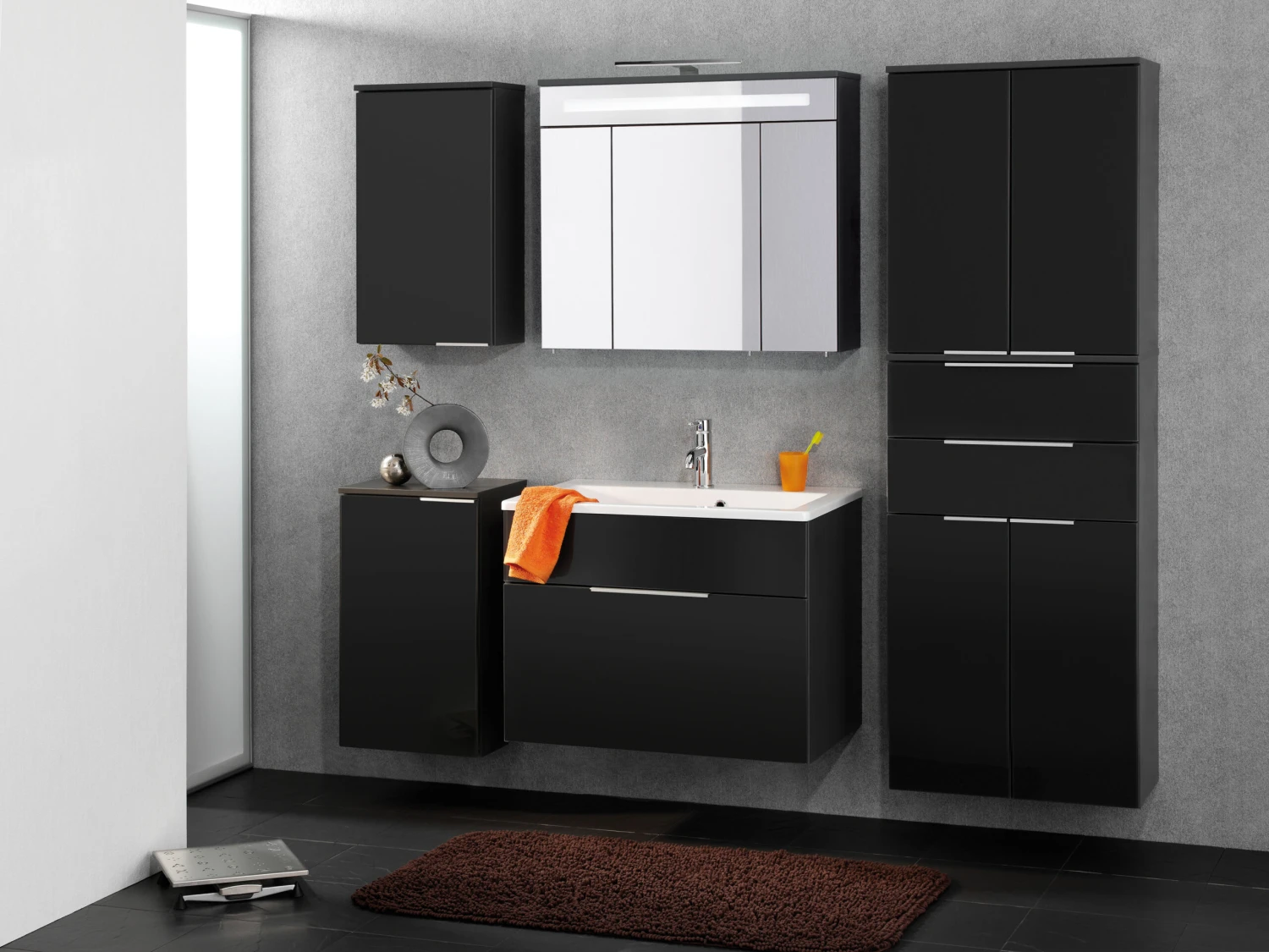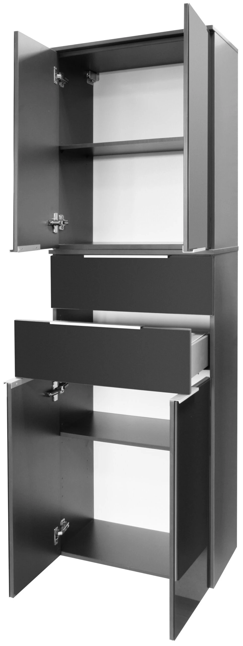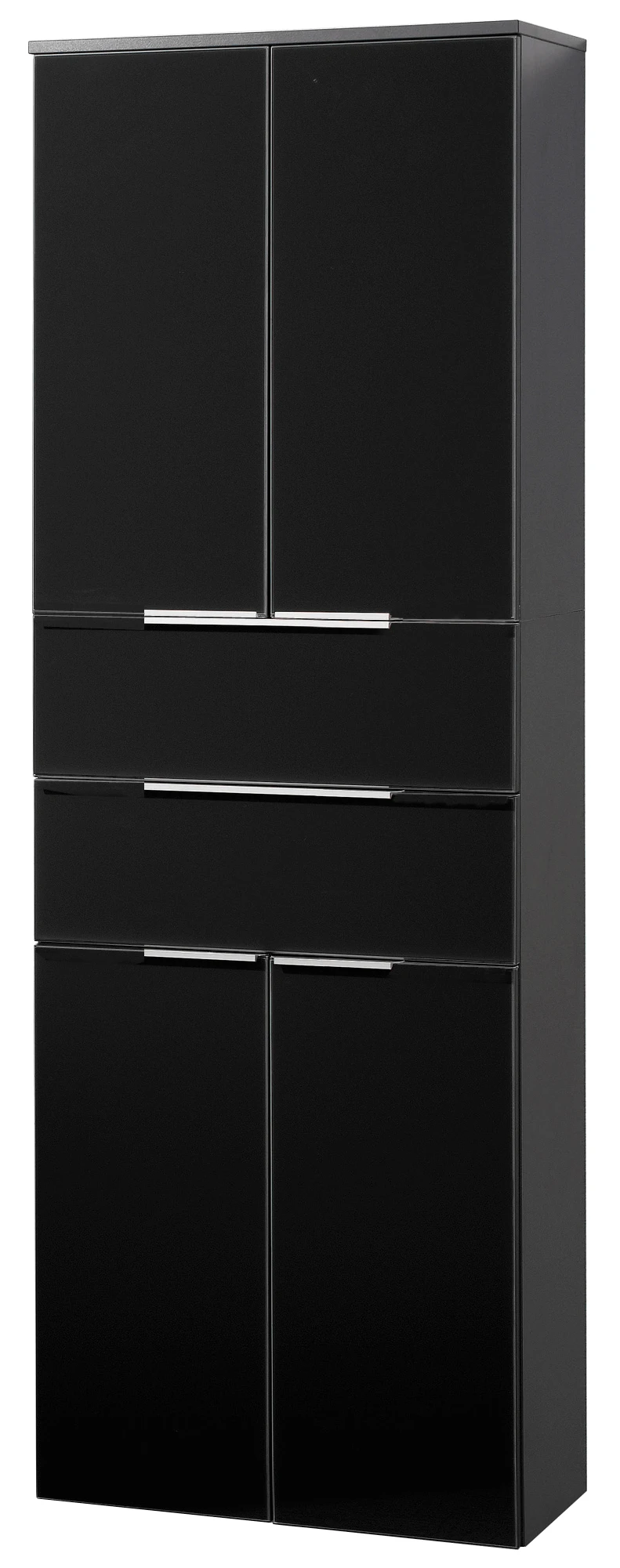 FACKELMANN KARA 80921 Hochschrank, B61xH176xT32,5 cm, Korpus anthrazit, Front anthrazit mit lackiertem Glas, 4 Türen, gedämpfte Scharniere, 2 Schubladen mit Softclose, Griffleisten aus Aluminium, 2 Einlegeböden, Korpus aus 2 Teilen, hängend, vormontiert, wasserfeste quellsichere Verleimung. Mut zur Farbe! KARA steht bei Fackelmann für Stil und Eleganz. Ein anthrazitfarbener Korpus und das Zusammenspiel aus Fronten mit dunkel-grau oder weiß lackiertem Glas oder alternativ Korpus in weiß-matt in Kombination mit Fronten aus weiß lackiertem Glas machen dieses Badmöbel zum Anziehungspunkt des ganzen Hauses. KARA – ein vormontiertes Badmöbelprogramm zur bequemen Selbstinstallation Made in Germany
