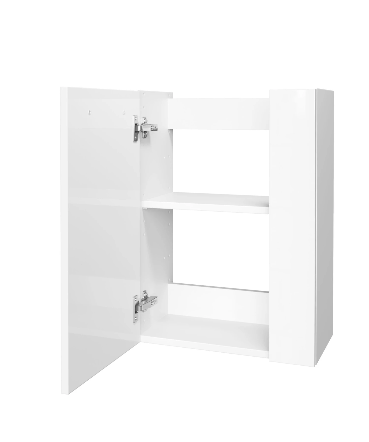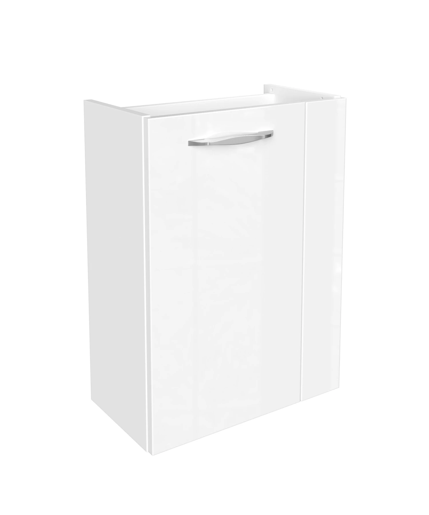 FACKELMANN SCENO 82393 Mini-Waschtischunterbauschrank, B44xH60xT24,5 cm, Korpus Weiß glanz, 1 seitliche Blende Weiß-Hochglanz, 1 Tür Weiß-Hochglanz Anschlag wählbar, gedämpfte Scharniere, Metallgriff chromglänzend, 1 Einlegeboden, hängend, zerlegt zur Selbstmontage, wasserfeste quellsichere Verleimung.