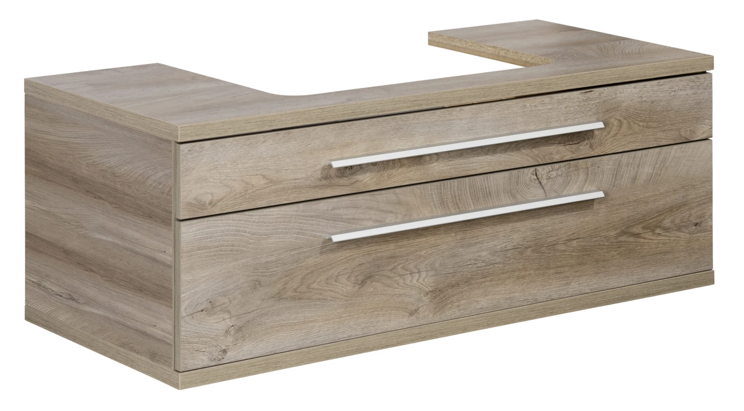 FACKELMANN STANFORD 80017 Waschtischunterbauschrank, B110xH41xT50 cm, Korpus + Front Nature-Oak-Optik, 2 Schubladen mit Softclose, inklusive Raumsparsiphon, mit Ausschnitt für Keramikbecken 80001, hängend, vormontiert, wasserfeste quellsichere Verleimung, Durch den natürlichen Look des markanten Holzdekors bringt STANFORD mehr Gemütlichkeit ins Badezimmer. Neben der Nature-Oak-Optik ist auch eine klassische Ausführung in Weiß glanz/Weiß-Hochglanz, eingerahmt durch massiv wirkende Platten in Nature-Oak-Optik erhältlich. STANFORD – ein vormontiertes Badmöbelprogramm zur bequemen Selbstinstallation Made in Germany