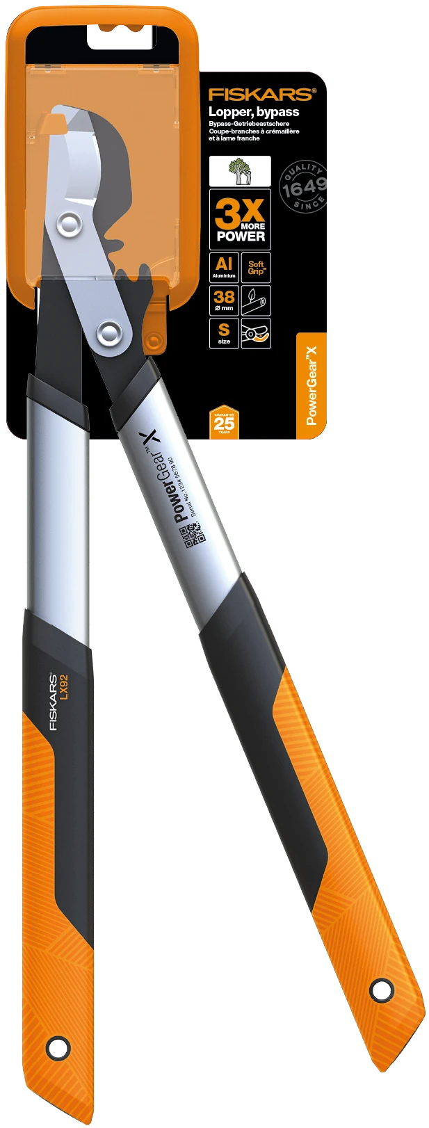 Lieferumfang: 1x Fiskars PowerGear X Bypass-Getriebeastschere LX92-S, Länge: 57 cm, Gewicht: 0,93 kg, Material: Präzisionsstahl/Antihaftbeschichtet, Farbe: Schwarz/Orange, 1020186