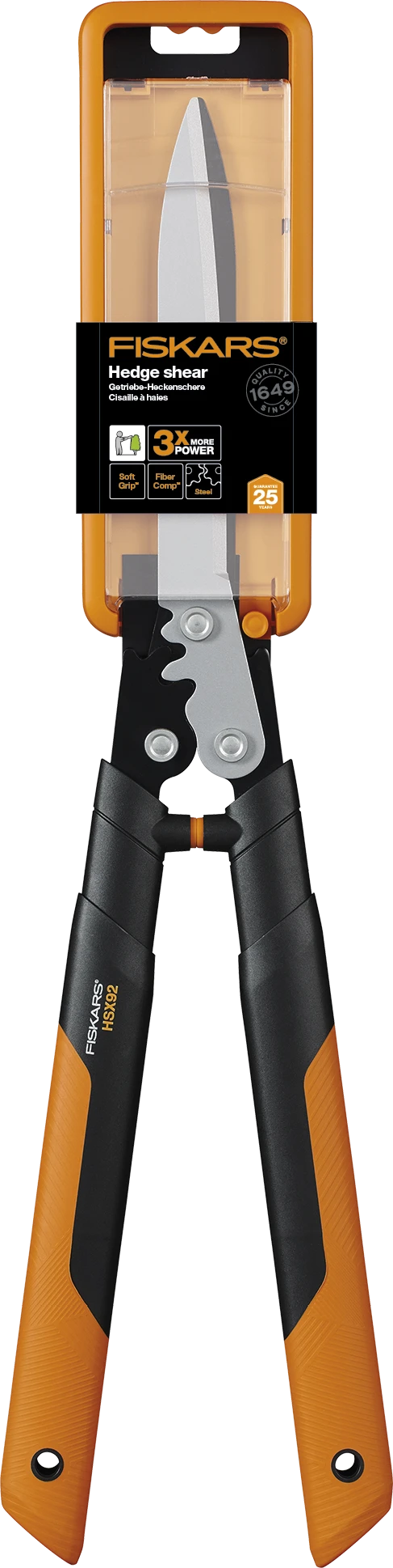 Lieferumfang: 1x Fiskars PowerGear X Getriebe-Heckenschere HSX92, Länge: 63 cm, Gewicht: 1,1 kg, Material: Hochwertiger Stahl/Kunststoff, Farbe: Schwarz/Orange, 1023631