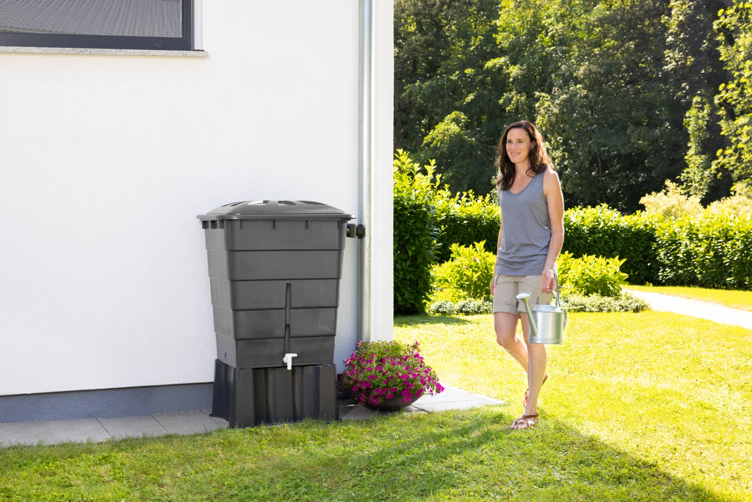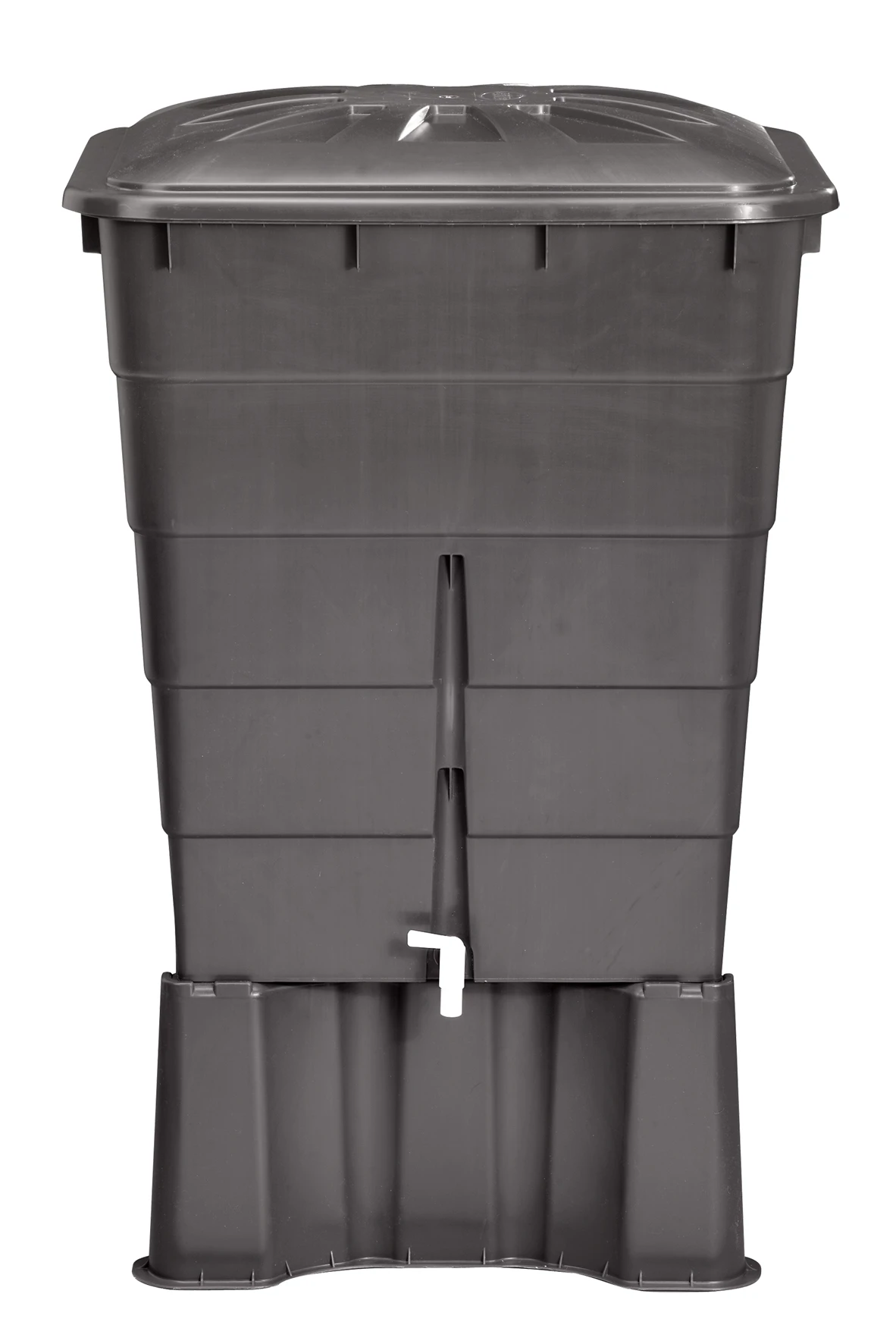 Klassische Regentonne in schlichtem Grau Komplett mit Deckel und Hahn die einfachste und bequemste Lösung zum Sammeln von Regenwasser Kostbares Trinkwasser sparen Metallverstrebung für mehr Stabilität Optional mit Regentonnen-Unterstand Hergestellt aus 100% Recyclingmaterial (PP)