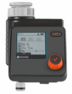Mit der GARDENA Bewässerungssteuerung Select lässt sich die Bewässerung flexibel und individuell planen. Für die Bewässerung lassen sich drei unterschiedliche und voneinander unabhängige Zeitpläne erstellen. Einstellbar sind Start, Dauer und Wochentage der Bewässerung. Die Steuerung ist batteriebetrieben, wird direkt an den Wasserhahn angeschlossen und lässt sich leicht durch nur einen Dreh- und Drückschalter zur Auswahl der Daten und zur Bestätigung bedienen. Ein gut lesbares LC-Display zeigt alle Einstellungen auf einen Blick an. “Water Now“ Funktion: Soll die Bewässerung einmal sofort gestartet werden, lässt sich diese manuell aktivieren, ohne das Gerät vom Wasserhahn zu entfernen oder Einstellungen zu verändern. Die Bewässerungssteuerung funktioniert durch die “Safe Stop“ Technologie immer zuverlässig: Ist der Energiestand der Batterie zu gering, um einen Bewässerungsvorgang komplett zu steuern, wird er gar nicht erst gestartet. Die Batterieanzeige im Display weist rechtzeitig darauf hin, wenn die Batterie ausgetauscht werden muss. Die wetterbeständige Bedieneinheit ist abnehmbar. Der Einsatz in Kombination mit einem GARDENA Bodenfeuchtesensor ist möglich.GARDENA gewährleistet höchste Qualität durch die Auszeichnung “Made in Germany“. Dieses Produkt garantiert für eine effiziente Bewässerung, denn jeder Tropfen zählt. .