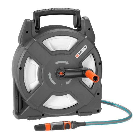 Die GARDENA Terrassen-Schlauchbox verfügt über einen 10 Meter langen Schlauch, der sauber aufbewahrt und gut zu transportieren ist. Damit ist sie für die Bewässerung von kleinen Gärten und Terrassen optimal geeignet. Die Schlauchbox ist klein und leicht und deshalb auch für Camping-, Wassersport- oder andere Freizeitaktivitäten der perfekte Begleiter. Für den Transport und die platzsparende Aufbewahrung lassen sich die Handkurbel und der Tragegriff einfach einklappen. Die Schlauchbox ist komplett mit einer 1,5 Meter langen Anschlussgarnitur sowie den nötigen GARDENA Systemteilen und einer Reinigungsspritze ausgestattet. Dann heißt es: Anschließen – Schlauch ausrollen und Wasser marsch!