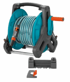 Für kleinere bis mittlere Gärten. 1 Produkt für 2 Einsatzgebiete: Zur Aufbewahrung des Schlauches an der Wand, jederzeit abnehmbar für mobilen Einsatz im Garten. Einklappbare Handkurbel, integrierter Tragegriff, abgewinkelter Schlauchanschluss.