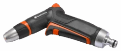 Das Premium SpritzenmodelI zur Reinigung und feinsprühenden Bewässerung. Stabile Metall-/Kunststoff-Ausführung mit optimierter Gewichtsverteilung und Weichkunststoff-Elementen für angenehme Handhabung. Wasserstrahl stufenlos regulierbar vom Vollstrahl bis zum feinen Sprühnebel. Stufenlose Dosierung der Wasserabgabe. Ergonomischer Impulsauslöser mit bequemer Dauerarretierung. Robuste und unverlierbare Spritzenhülse. Set bestehend aus: 18305, 18253