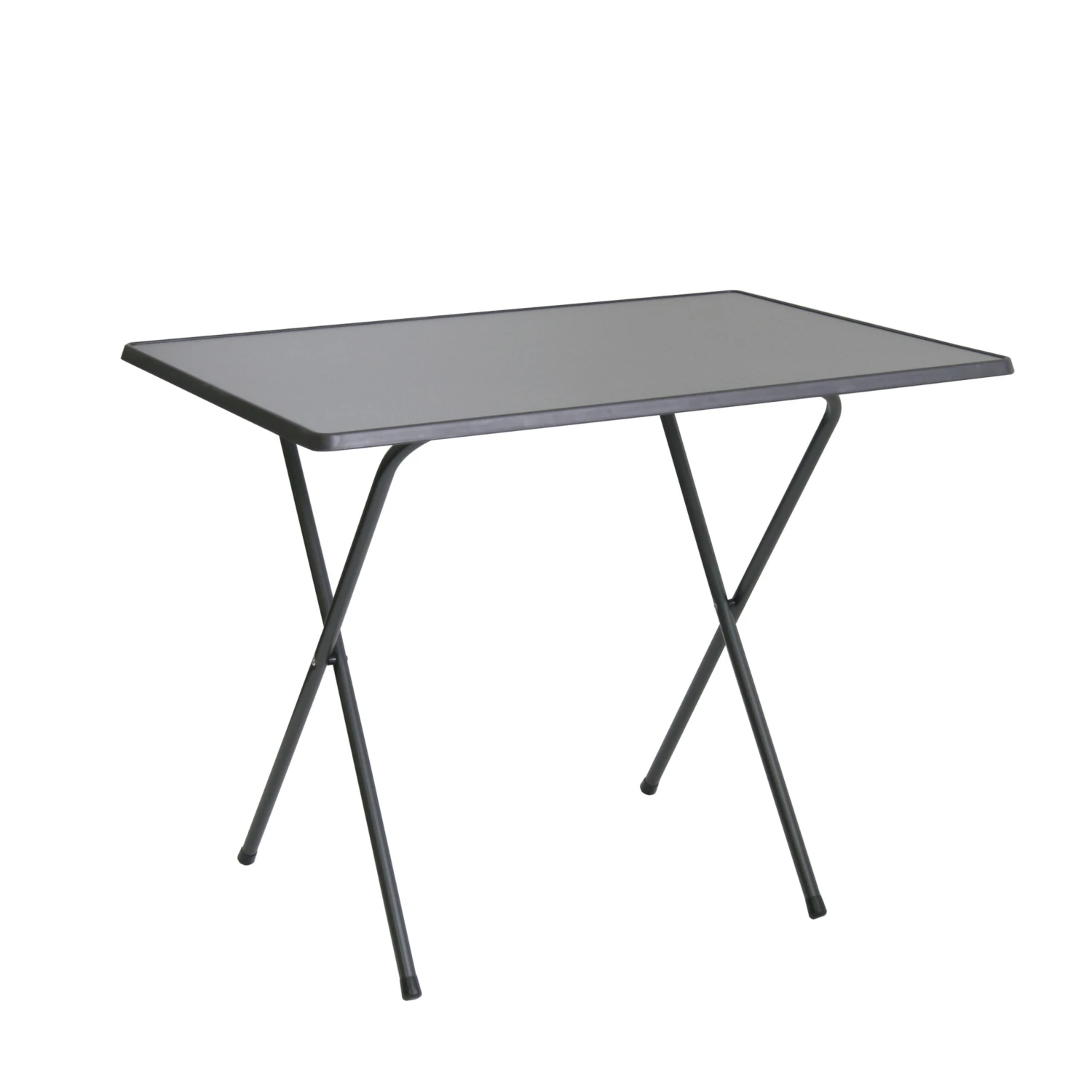 Einfach und unkompliziert präsentiert sich der praktische Scherentisch. Sein Gestell ist aus robustem Stahl gefertigt und eisengrau. Die Holz-/Kunststoffgemisch-Platte des Tisches weist eine attraktive Musterung in Anthrazit auf, hat eine hohe Beständigkeit gegen Witterungseinflüsse und relativ unempfindlich. Zudem ist sie sehr pflegeleicht, feucht abwischen reicht in den meisten Fällen völlig aus. Das Möbelstück lässt sich einfach aufstellen, aber auch genauso einfach wieder zusammenklappen und verstauen. Gerade im Campingurlaub oder auf dem Balkon kann der Tisch zum Einsatz kommen.