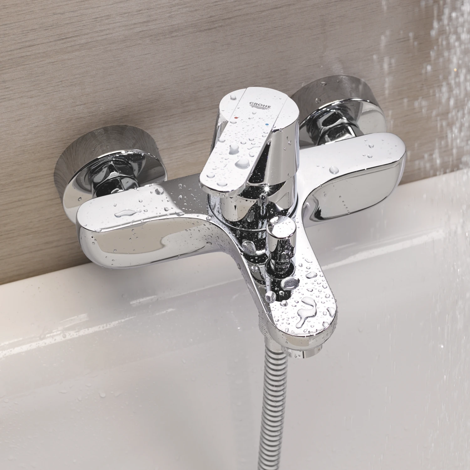 Wandmontage Bedienungshebel aus Metall GROHE SilkMove 46 mm Keramikkartusche variabel einstellbare Mengenbegrenzung GROHE StarLight Oberfläche automatische Umstellung: Wanne/Brause integrierter Rückflussverhinderer im Brauseabgang 1/2″ Auslauf mit Mousseur S-Anschlüsse Eigensicher gegen Rückfließen Armaturengruppe I nach DIN 4109 Brauseabgang 1/2″ mit integriertem Rückflussverhinderer