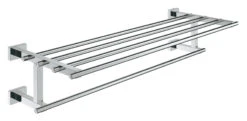 Mit der GROHE Essentials Cube Handtuchablage nutzen Sie den in Ihrem Badezimmer verfügbaren Raum intelligent. Die horizontale obere Ablage eignet sich perfekt, um gefaltete Handtücher aufzubewahren, während die anderen auf der Stange darunter trocknen. Mit der kubistische Form und den klaren Linien ist sie die perfekte Wahl für zeitgemäße Badezimmer. Die glänzende, langlebige GROHE StarLight Chromoberfläche sieht auch noch nach Jahren makellos aus. Material: Metall 600 mm (Bohrabstand 558 mm) Verdeckte Befestigung GROHE StarLight Oberfläche