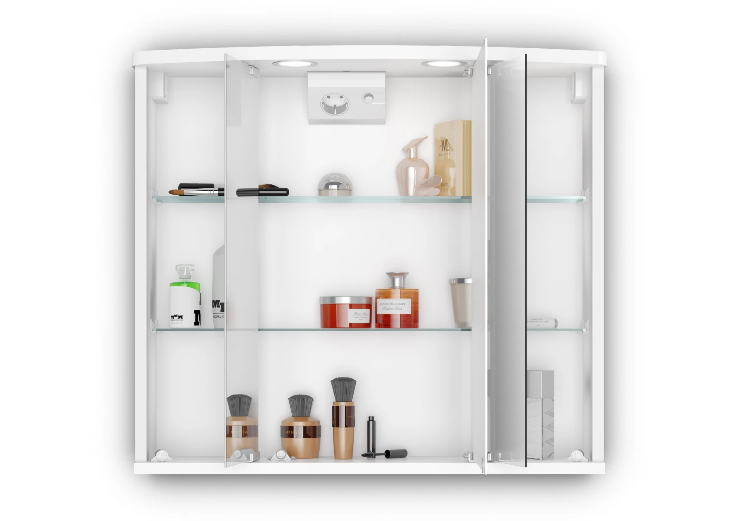 Material: MDF/Holz ; Farbe: weiß ; Maße (BxHxT): 68,0 cm x 60,0 cm x 22,0 cm ; Beleuchtung: 2 LED-Spots, 240 Lumen, Lichtfarbe: Neutral-Weiß