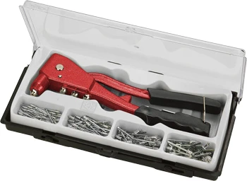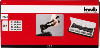 schwere Ausführung mit Griffschutz, für Blindnieten aus Aluminium und Kupfer bis 4,8 mm Schaft-Durchmesser, aus anderen Materialien bis 4 mm Schaft-Durchmesser, inkl. 100 Nieten in den Größen: 25 Nieten 2,4 x 5 mm, 25 Nieten 3,2 x 8 mm, 25 Nieten 4,0 x 8 mm, 25 Nieten 4,8 x 8 mm.