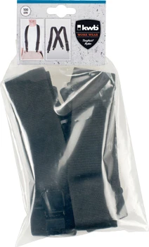 Hosenträger, schwere Handwerker-Qualität, extra breiter Nylon-Gurt und Gummizug auf dem Rücken für eine gleichmäßige Belastung und hohen Tragekomfort, einfache Längsverstellung, 4 robuste Metallclips zum individuellen Befestigen am Hosenbund, im Rückenteil mit Lederplatte verstärkt, einfache Nahtreihe mit silbernem Fäden, inkl. kwb WORK WEAR Label, 100 cm lang, 5,1 cm breit.