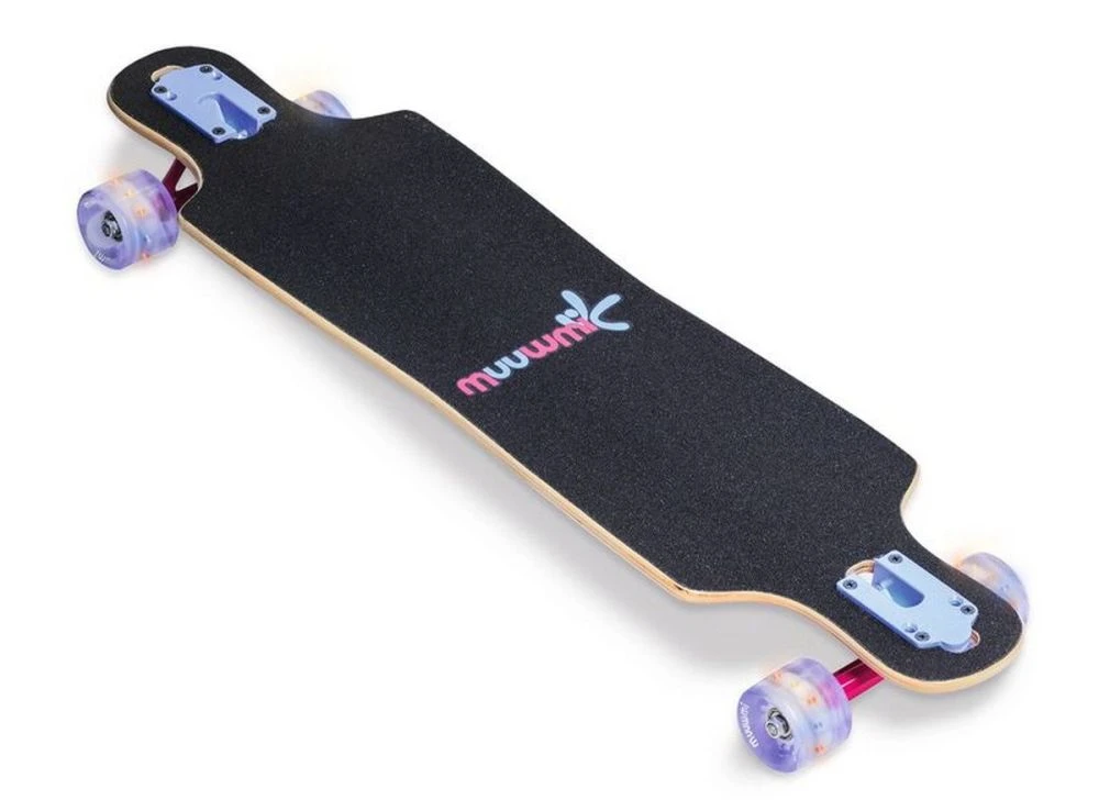 muuwmi Longboard Compact Space, LED- Leuchtrollen, ABEC 7, Deck 83×22 cm, 5,5 Zoll FOX Aluminium Trucks, Rollen 60×45 mm