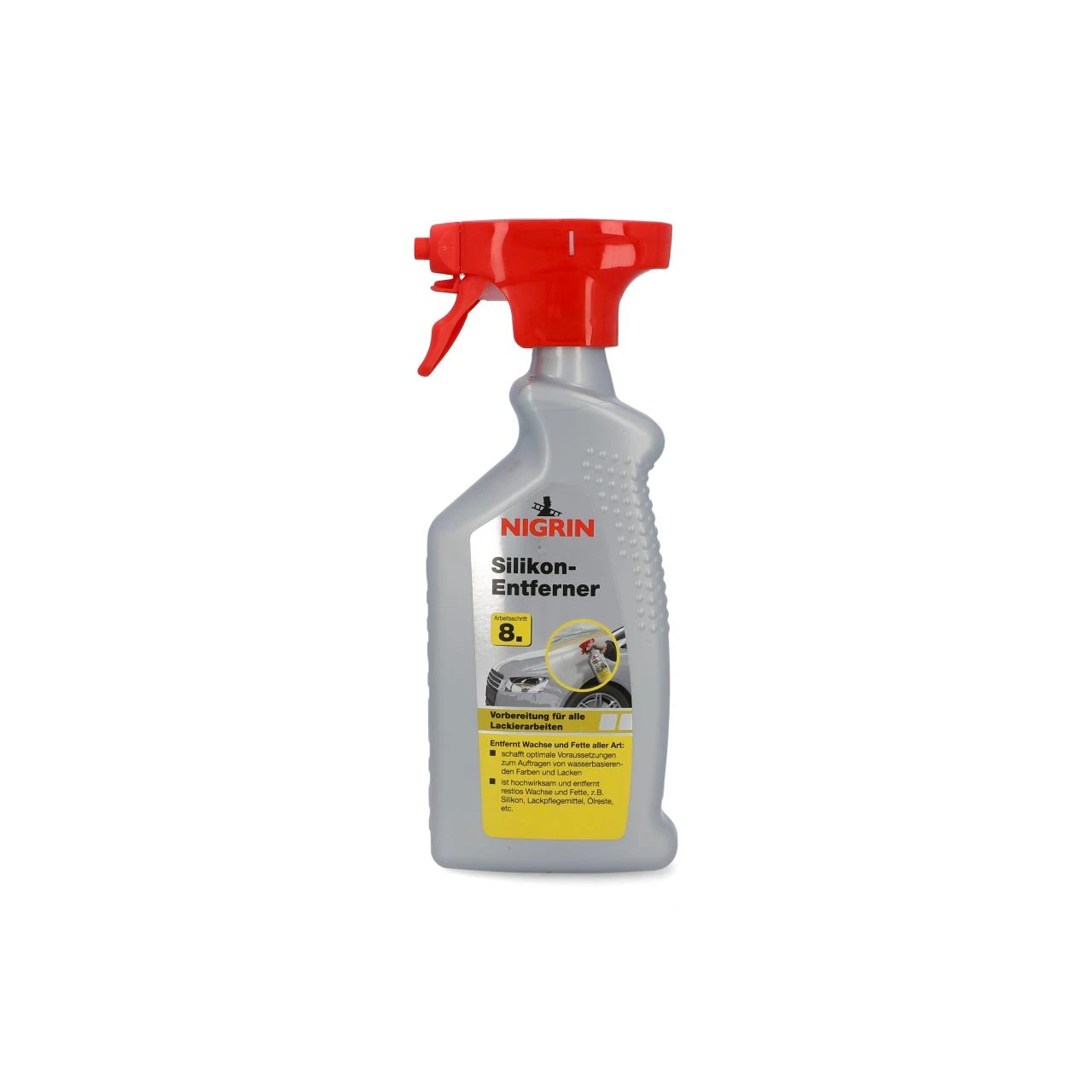 NIGRIN Silikon-Entferner ist die hochwirksame und unerlässliche Vorbereitung für alle Lackierarbeiten. Es entfernt restlos Wachse und Fette aller Art, z.B. Silikon, Lackpflegemittel, Ölreste und schafft damit optimale Voraussetzungen zum Auftragen von Wasserbasierenden Farben und Lacken.