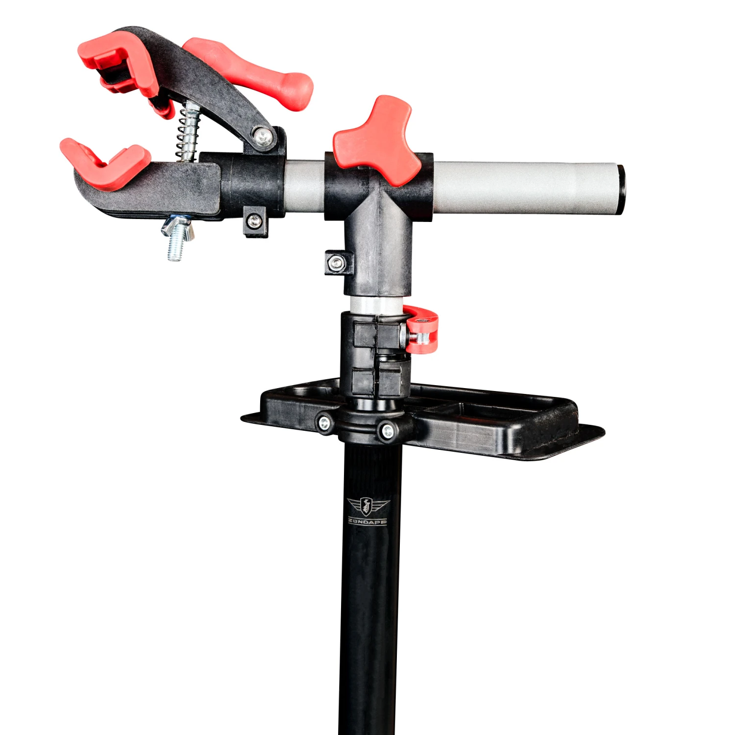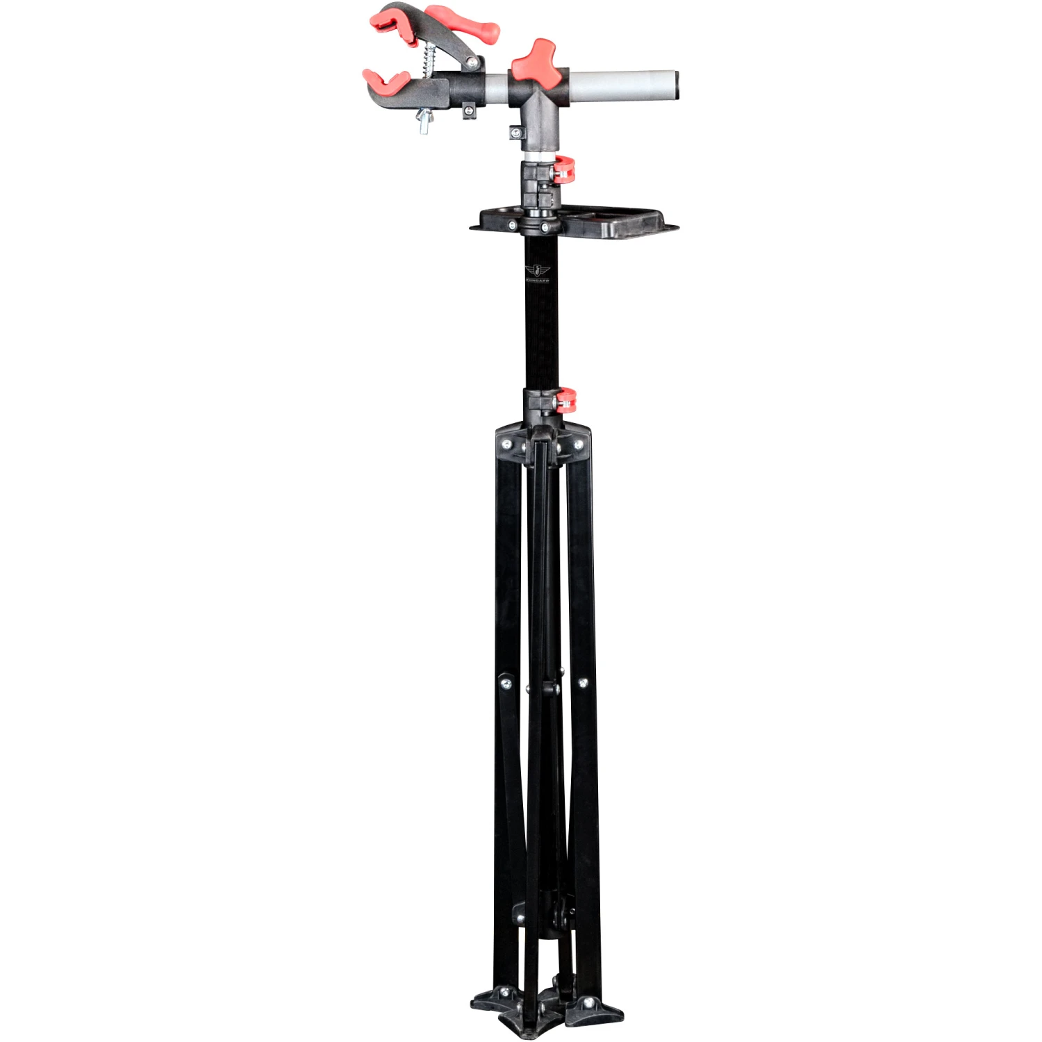 Mit diesem praktischen Reparaturständer wird die Fahrradreparatur einfacher und angenehmer. Der Fahrradreparaturständer besteht aus robustem Metall, hat vier Beine für stabilen Stand und ist von 100 bis 170 cm Höhe verstellbar, sodass du in einer für dich passenden Arbeitshöhe bequem agieren kannst. Im praktischen Ablagefach am Ständer kannst du Kleinteile und Werkzeug zwischenlagern und hast alles griffbereit, was du benötigst.