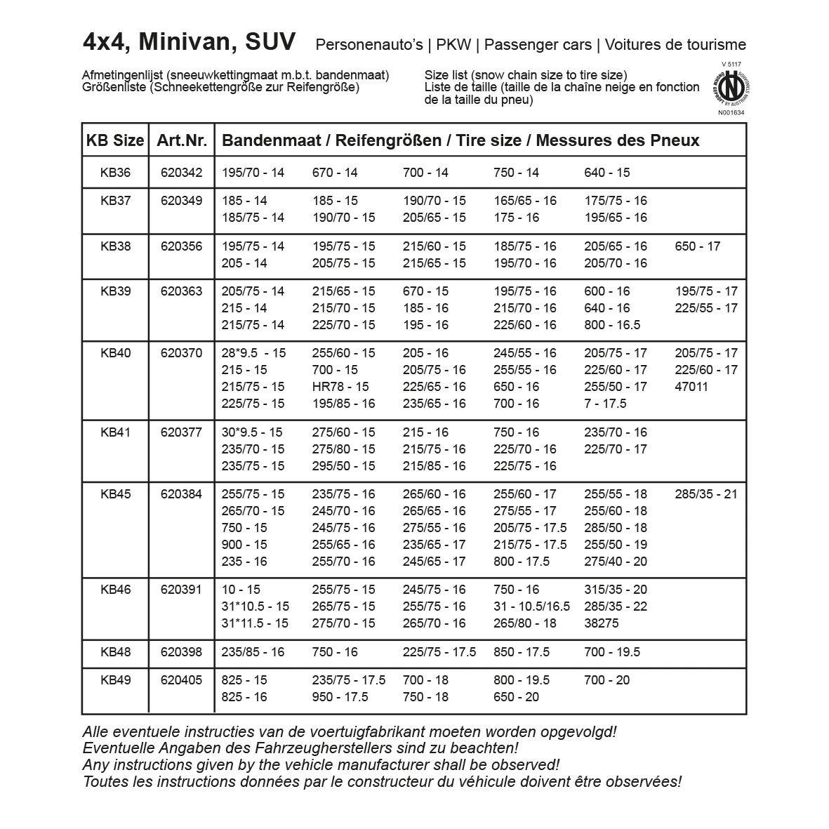 Reifengrössen: 700-15, 215-15, 215/75-15, 225/75-15, 28*9,5-15, 650-16, 700-16, 195/85-16, 205-16, 205/75-16, 225/65-16, 235/60-16, 235/65-16, 245/55-16, 255/55-16, 205/75-17, 215/65-17, 225/60-17, 255/50-17, 7-17.5, 700-17.5, HR78-15, 47011.