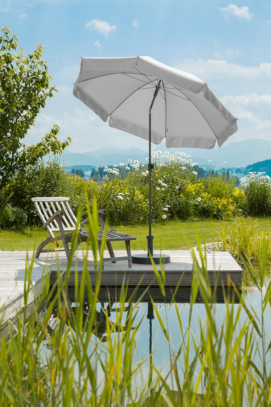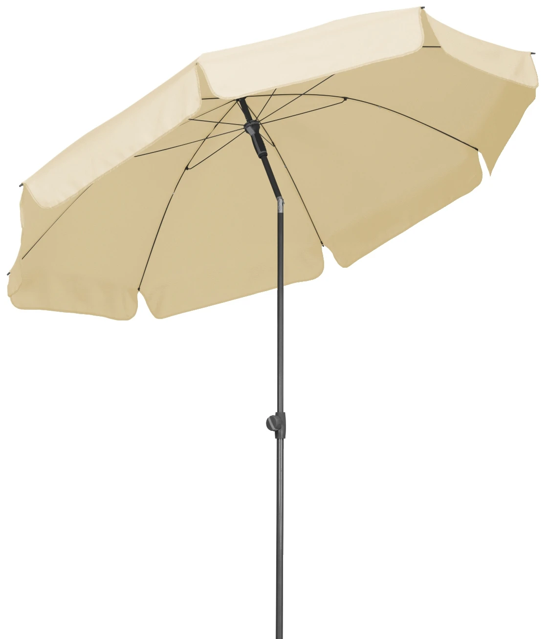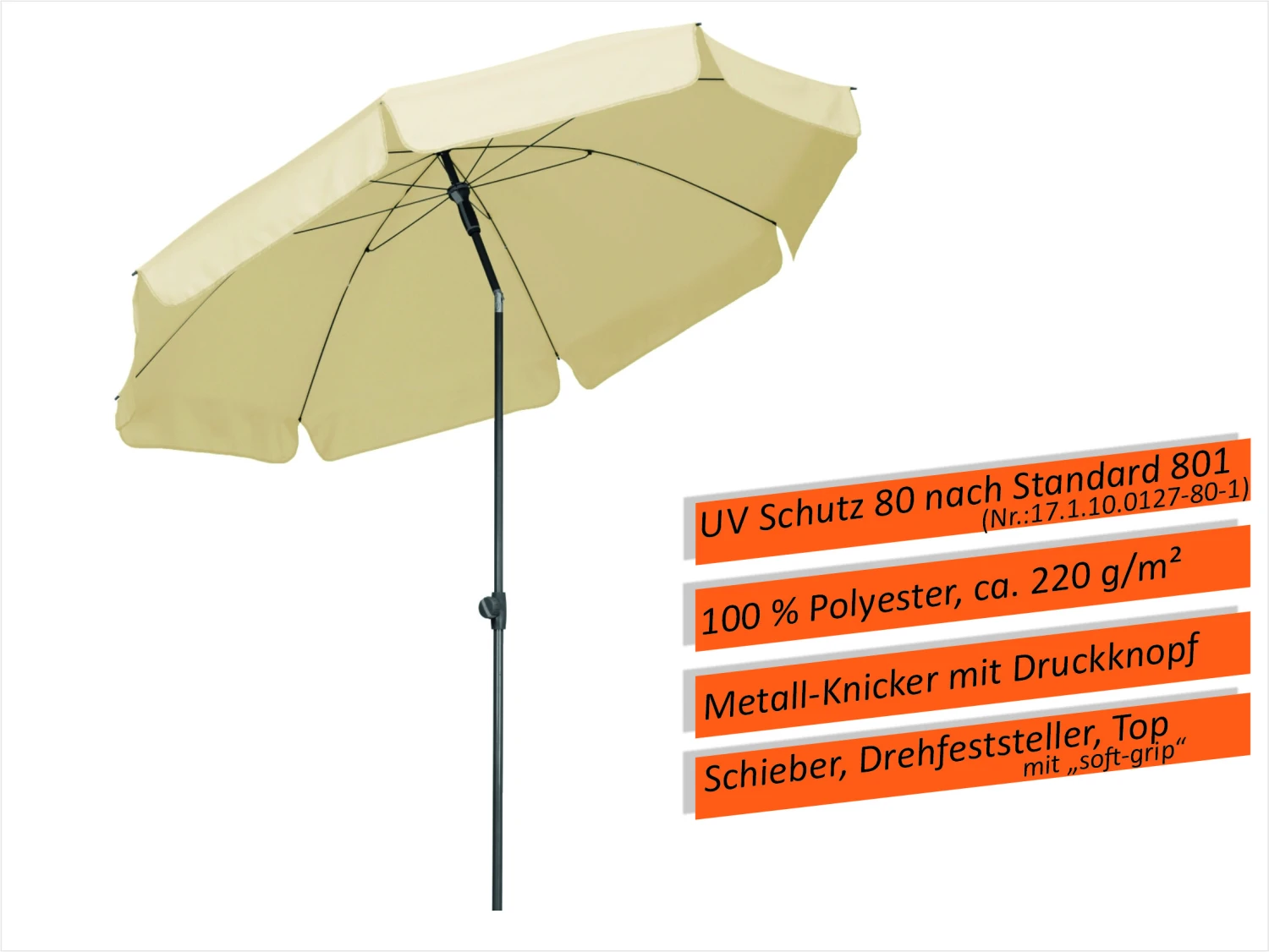 Ca. 200 Ø Bespannung 100 % Polyester, ca. 160 g/m², verrottungsfest, mit Volant und Bandeinfassung, runder Schirm mit ca. 200 cm Ø. Sortierte Farben: natur, terracotta, blau und grün. Stahl-Gestell weiß pulverbeschichtet, Stock 2-teilig 22/25 mm Ø, Streben aus Federstahl 3,8 mm Ø, mit Metallknicker. -Nur für den privaten Gebrauch im Außenbereich-