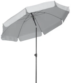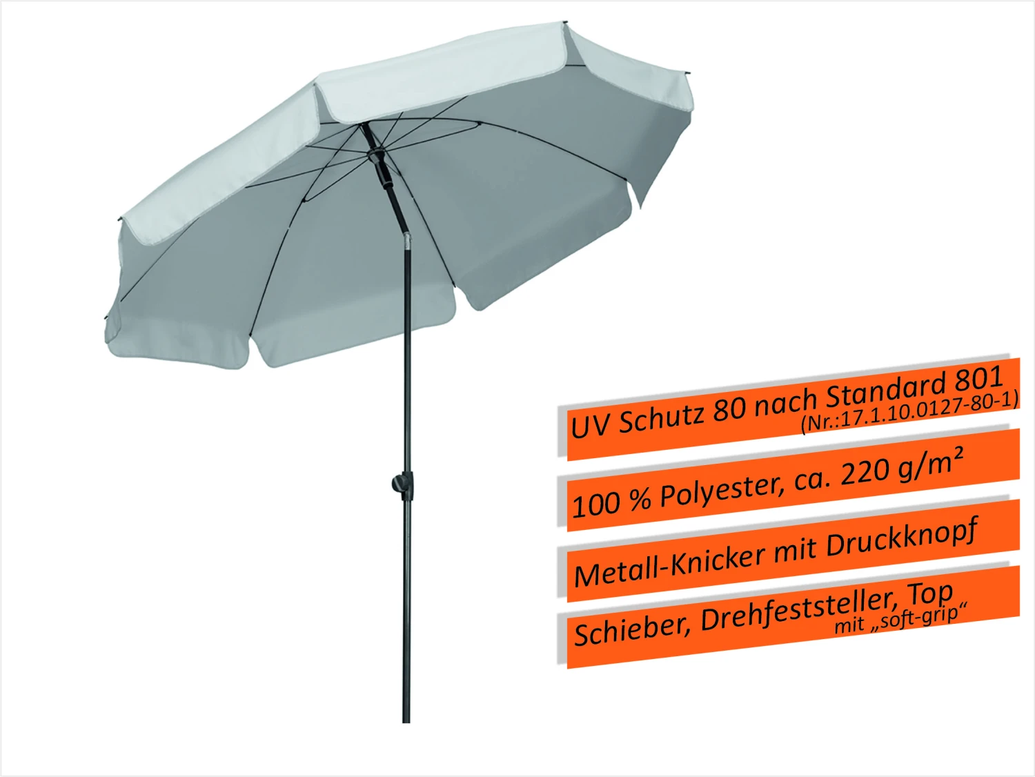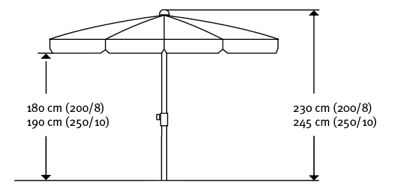 ca. 200 cm Ø Bespannung 100 % Polyester, ca. 220 g/m², mit strukturierter Oberfläche, verrottungsfest, wasserabstoßend imprägniert, mit Volant, mit Bandeinfassung, runder Schirm mit ca. 200 cm Ø, Lichtechtheitsstufe 6. Gestell anthrazit pulverbeschichtet, Metallknicker mit Druckknopf. Schieber, Drehfeststeller und Top 2-farbig und mit soft-grip, Stock 2-teilig 22/25 mm. Erhältlich in den Farben: natur, goldgelb, terracotta, dunkelrot, grün und silbergrau. -Nur für den privaten Gebrauch im Außenbereich-