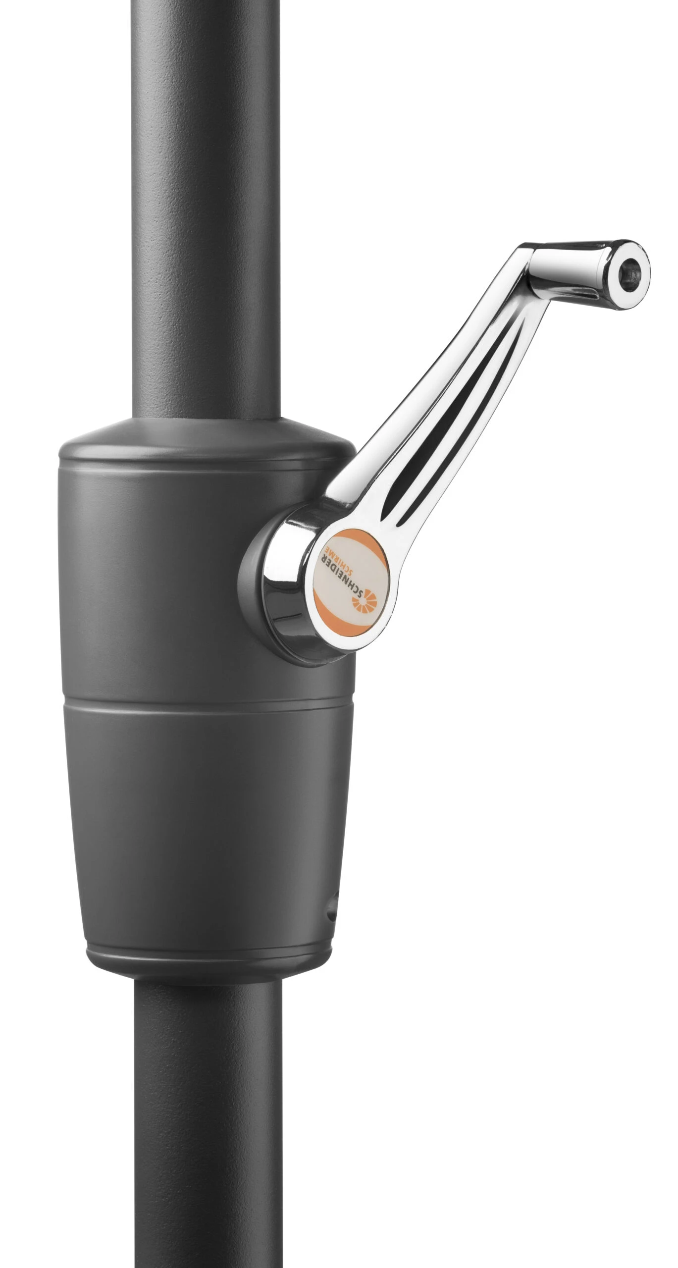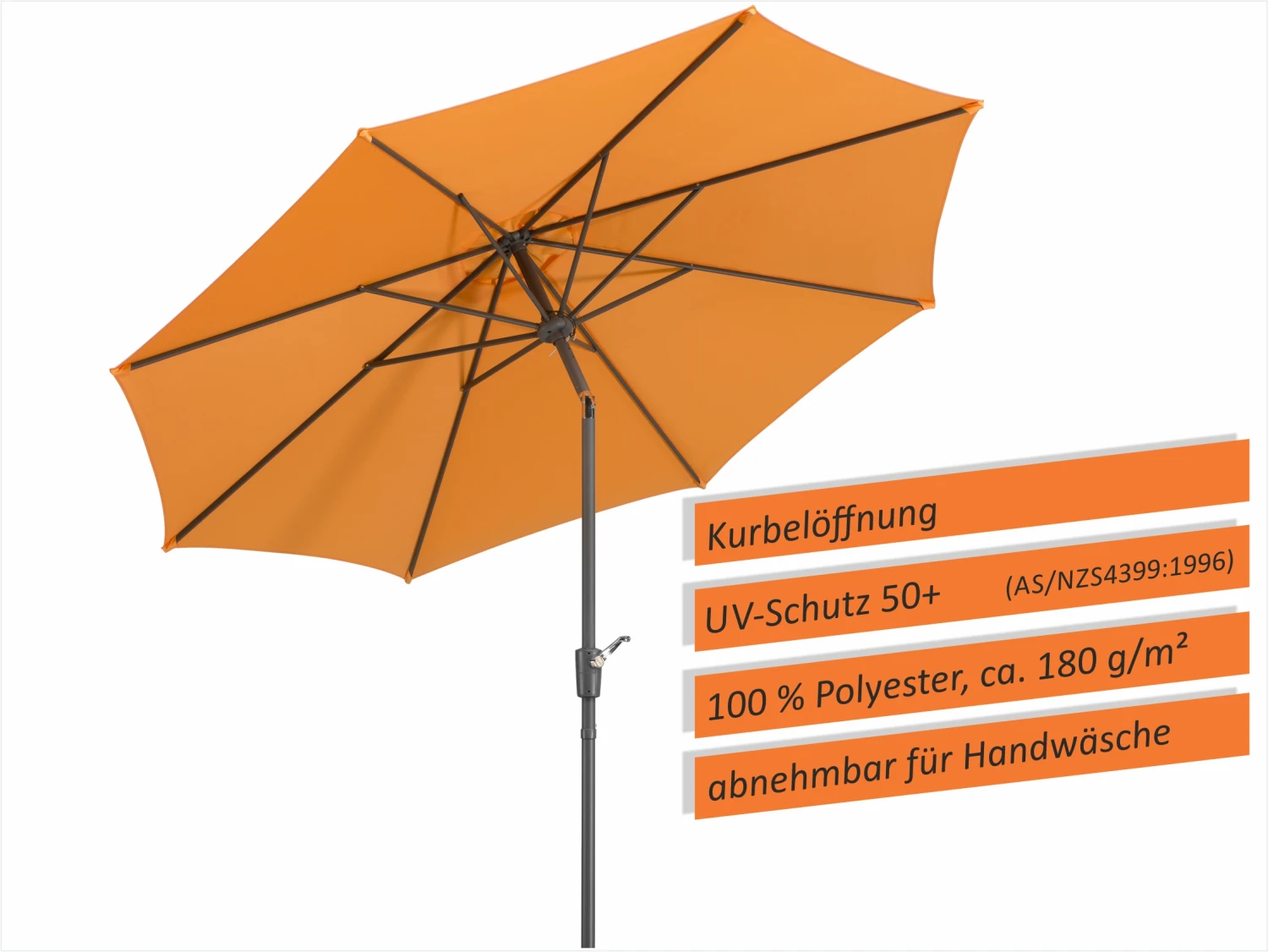 Unser Sonnenschirm Modell Harlem ist mit seinen topmodischen Farben ein echter Blickfang. Dieser Schirm bringt nicht nur Farbe in Ihren Garten oder auf Ihren Balkon, sondern verleiht ihm auch eine junge und frische Note. Harlem – der Trendige Der Schirm Harlem ist ein achteckiger Sonnenschirm mit einem Durchmesser von ca. 270 cm. Damit hat er eine angenehme Größe und passt auf fast jede Terrasse. Die Bespannung besteht aus 100 % Polyester und ist verrottungsfest. Die Stoffstärke liegt bei ca. 180 g/m², was sie sehr widerstandsfähig macht. Außerdem wird die Bespannung ohne Volant gefertigt, was die junge Note zusätzlich betont. Zudem verfügt diese über eine wasserabstoßende Imprägnierung, wodurch sie auch einem leichten Schauer standhält und im Nu wieder getrocknet ist. Mit einem UV-Schutz von 50+, festgelegt nach der australisch-neuseeländischen Norm, wird Ihnen mit diesem Produkt ein ausgezeichneter Sonnenschutz geboten. Besondere Merkmale Das Gestell besteht aus Stahl, schließt mit einem Kugeltop ab und ist ebenso wie die Streben anthrazitgrau pulverbeschichtet. Der Stock hat einen Durchmesser von ca. 38 mm und ist zweiteilig, wodurch Sie den Schirm problemlos auseinanderbauen und über den Winter platzsparend einlagern können. Zudem verfügt der Schirm über eine Kurbel und einen Knicker aus Metall. Die Kurbel ermöglicht ein leichtes Öffnen und Schließen des Schirmes. Mithilfe des Knickers haben Sie die Möglichkeit den Schirm entsprechend der Sonneneinstrahlung auszurichten, um so einen optimalen Sonnenschutz zu erreichen. Die Gesamthöhe des aufgestellten Schirmes beträgt ca. 260 cm, mit einer Durchgangshöhe von ca. 210 cm. Im geknickten Zustand beträgt die Gesamthöhe ca. 270 cm. Zubehör Um einen sicheren und stabilen Stand zu gewährleisten, empfehlen wir einen Schneider Schirmständer mit einem Mindestgewicht von ca. 40 kg. Folgende Artikel können zusammen mit diesem Schirmmodell verwendet werden: Rasen-Vierzack (Art. 863-00), Bodenhülse (Art. 827-00), Bodendübel (Art. 888-00), Plattenständer für Wegeplatten in der Größe 40 x 40 cm oder 50 x 50 cm (Art. 837-15), PE-Ständer ca. 40 kg anthrazit (Art. 857-15) oder PE-Ständer ca. 45 ltr. zum Befüllen mit Sand oder Wasser (Art. 856-01 weiß oder 856-15 anthrazit), Betonständer ca. 40 kg anthrazit (Art. 898-15) oder Granitständer ca. 42 kg (Art. 869-00). Außerdem empfehlen wir die Verwendung einer Schutzhülle bei Nichtgebrauch oder Regen, da Sie die Lebensdauer Ihres Schirmes dadurch erhöhen und länger Freude an dem erworbenen Produkt haben werden. Die Schutzhülle können Sie ebenfalls separat erwerben (Art. 821-00).